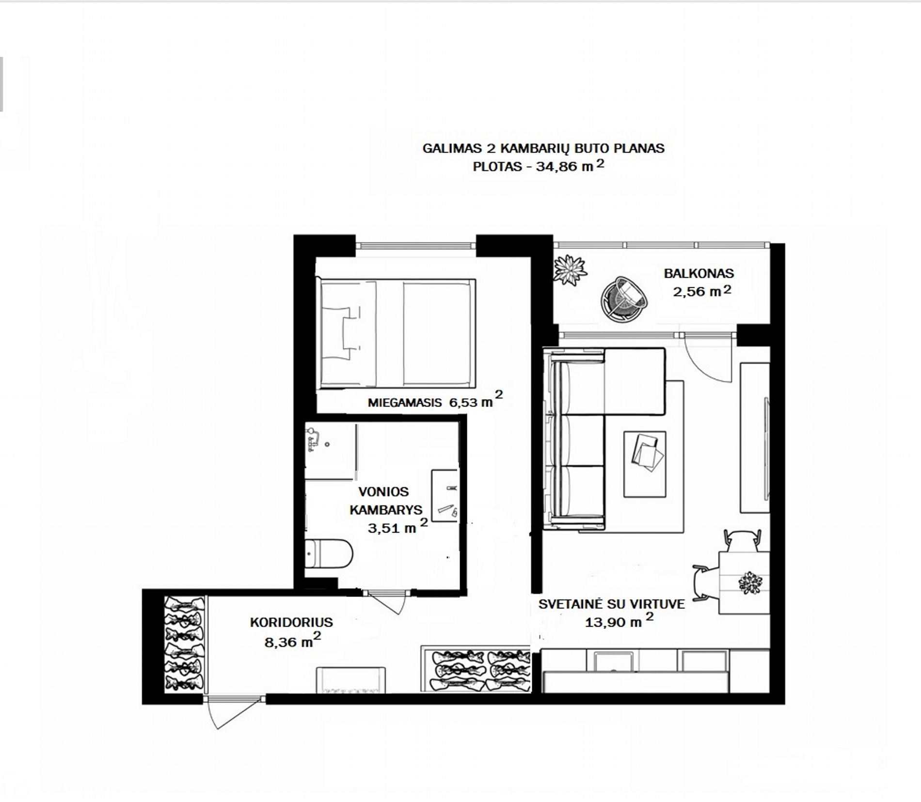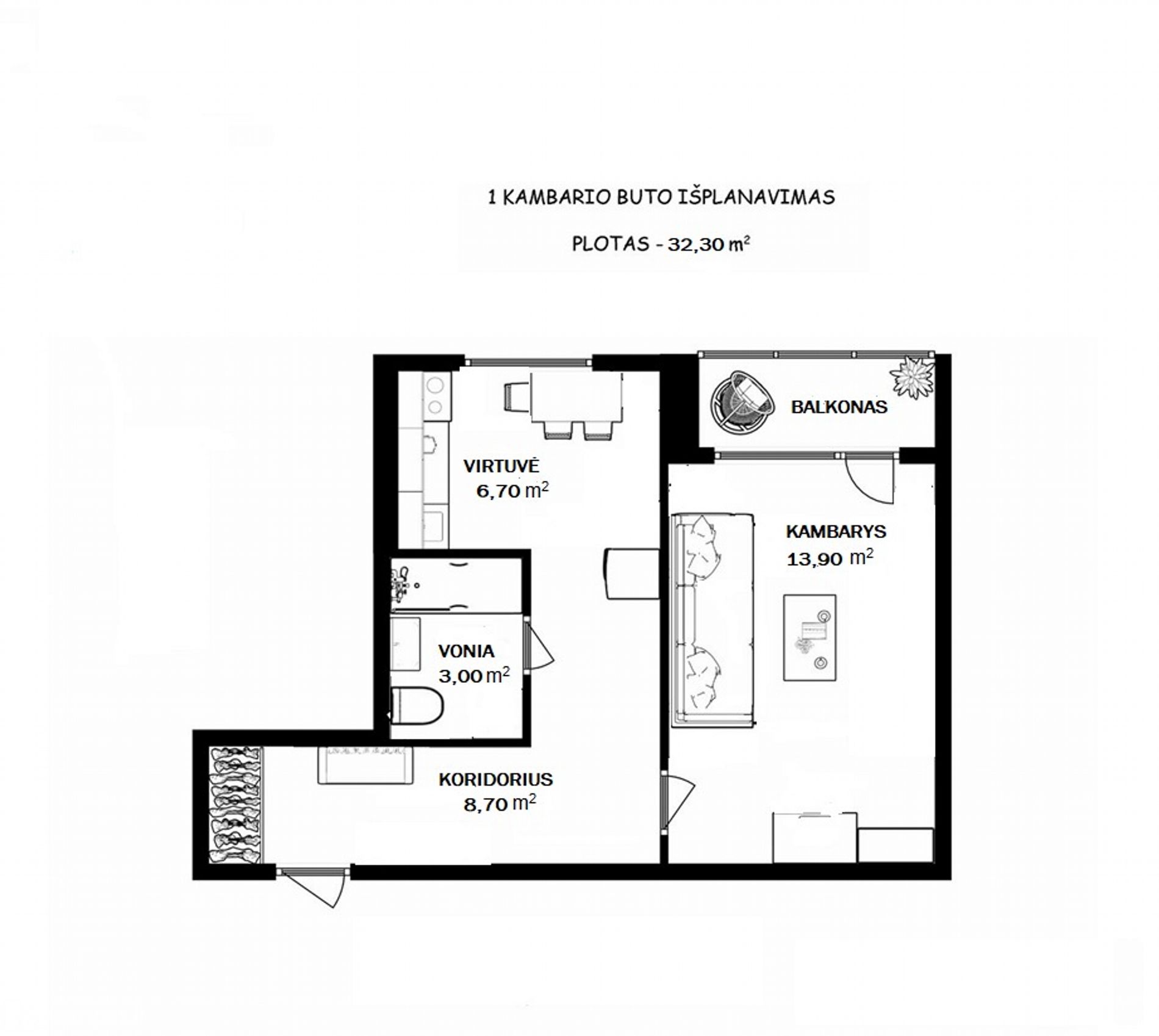 Plotas: 32,30 m² + ~2,56 m² balkonas