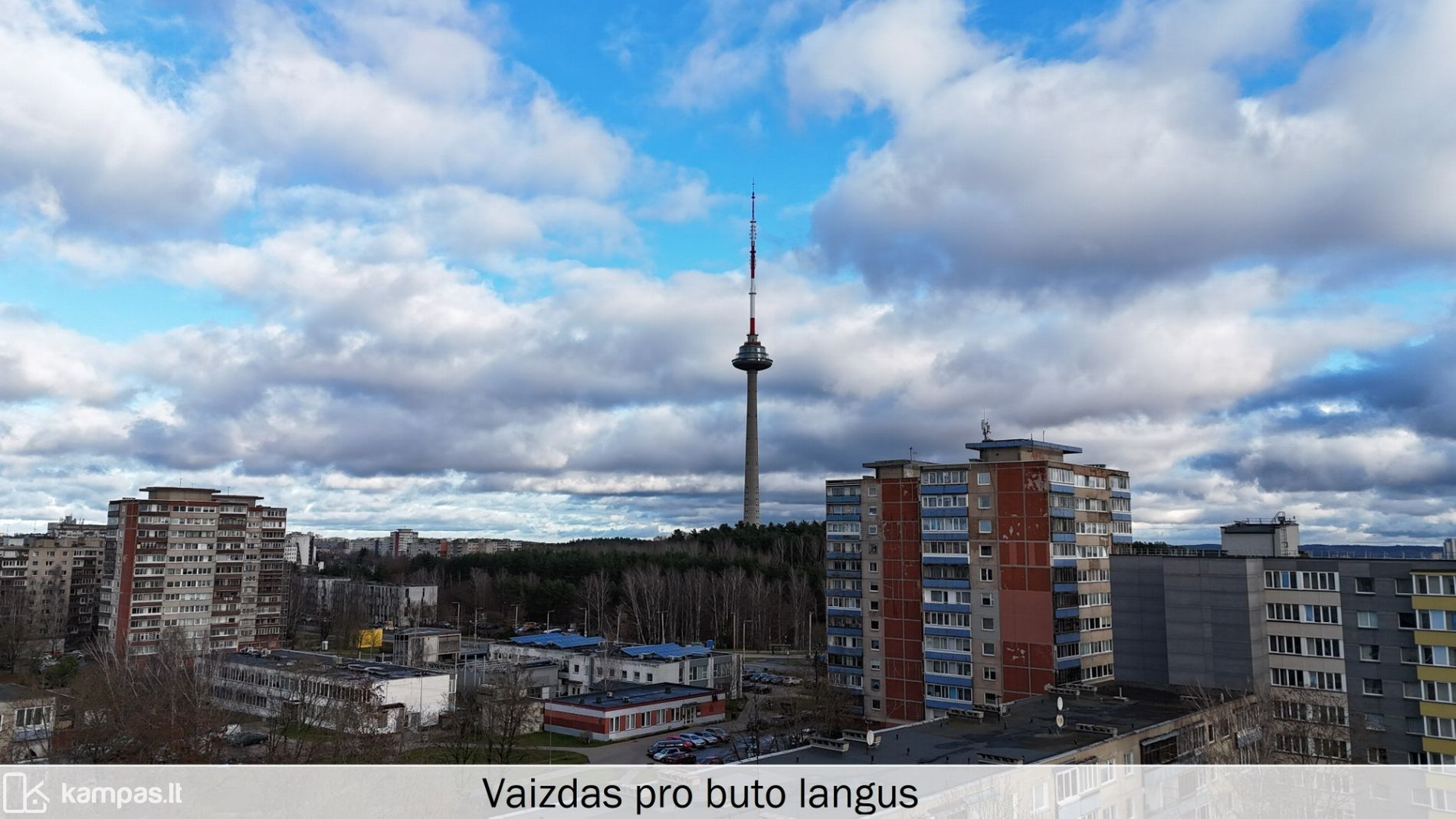 Puikūs vaizdai – pro langus matomas televizijos bokštas ir daug žalumos.