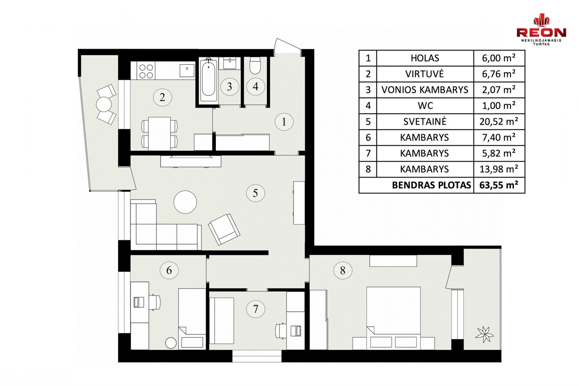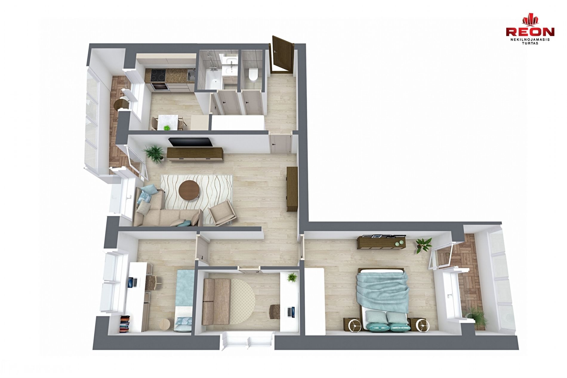 Labai patogus buto suplanavimas: du miegamieji kambariai skirtingose buto pusėse, o tarp jų darbo kambarys, labai erdvi svetainė, atskira virtuvė, vonios kambarys ir tualetas taip pat atskiri, du dideli įstiklinti balkonai. Butui priklauso rūsys. Pro buto langus atsiveria puikūs vaizdai, niekas neužstoja saulės, natūralios šviesos. Parduodamas su baldais ir įranga kaip parodyta nuotraukose.