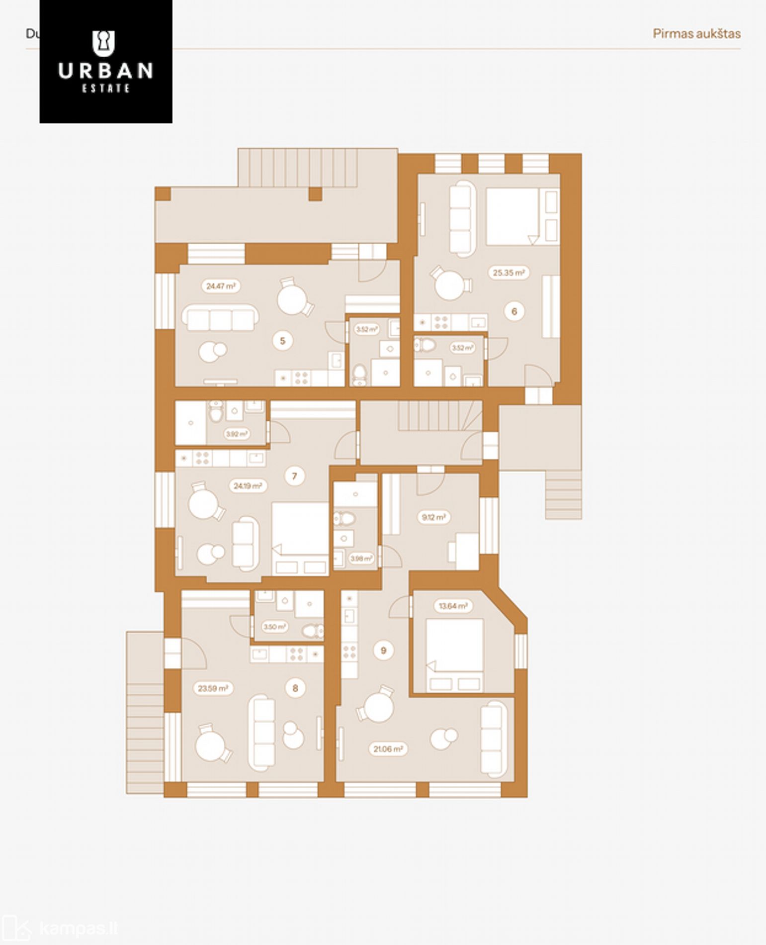 • Bendras plotas: nuo 20.06 iki 53,56 kv.m. + bendro naudojimo patalpų dalis;