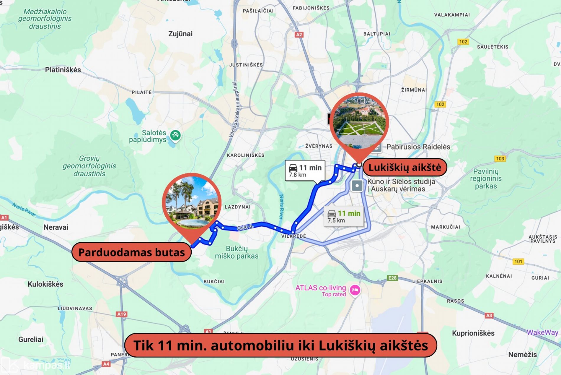 • Vos ~ 6,8 km iki Vilniaus centro – miesto širdį pasieksite vos per 10–15 minučių automobiliu;