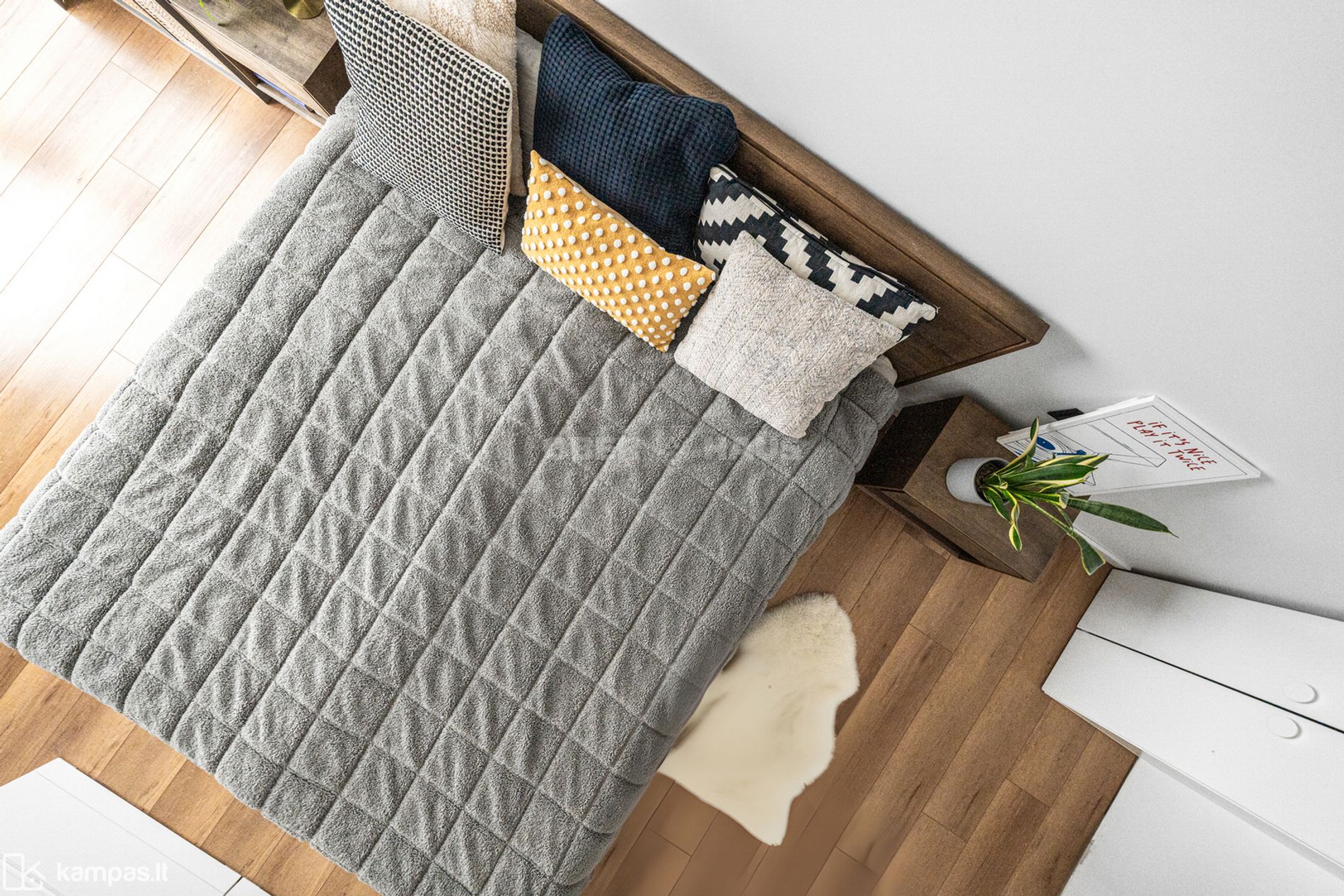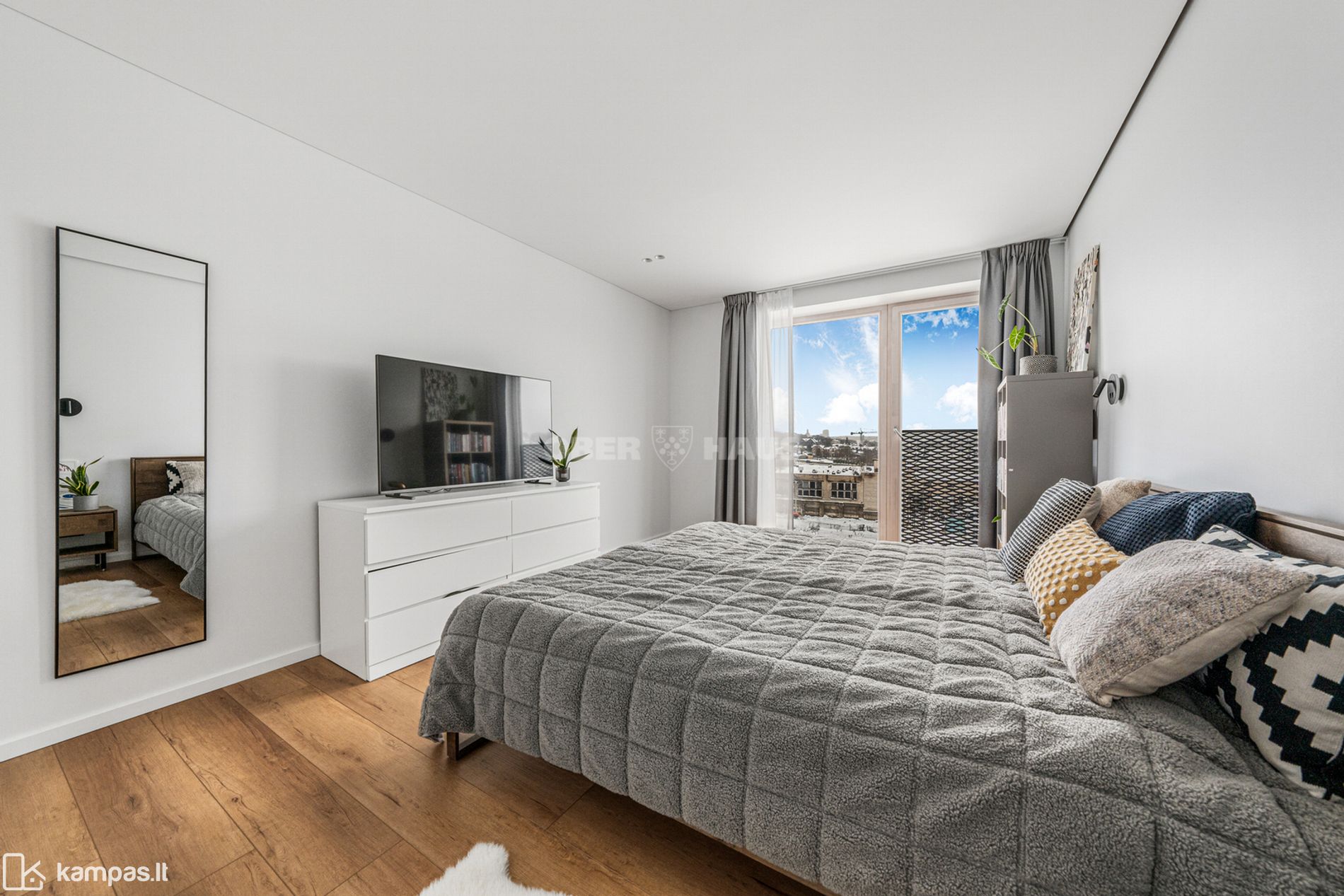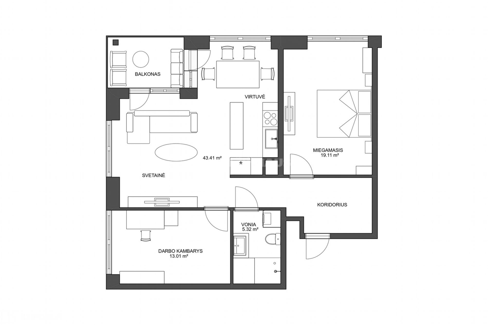 • Kambarių skaičius – 3 (svetainė su virtuve, miegamasis, miegamasis/darbo kambarys)