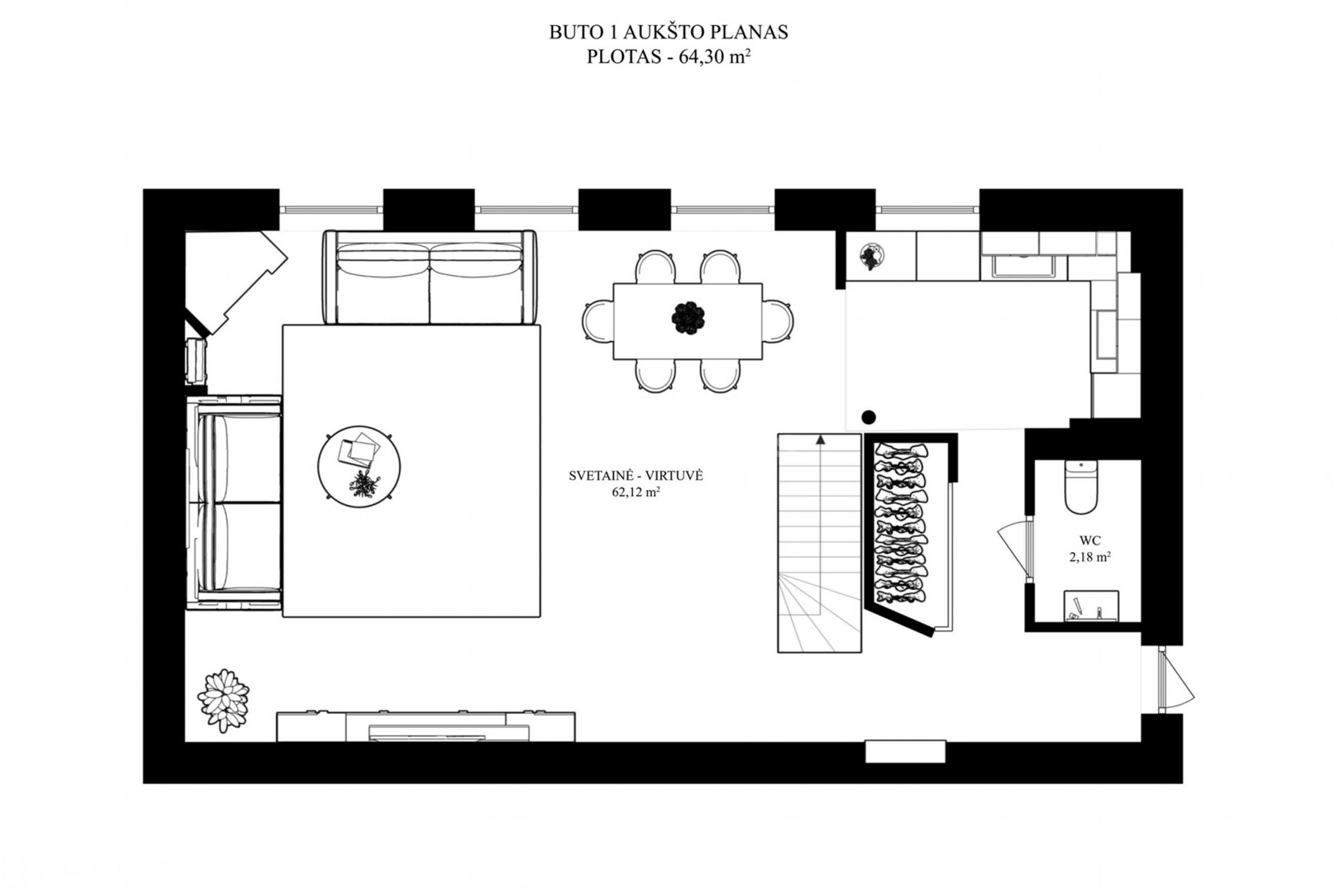• Aukštos, net 3,5 m lubos ir gausus langų kiekis užtikrina natūralią šviesą;