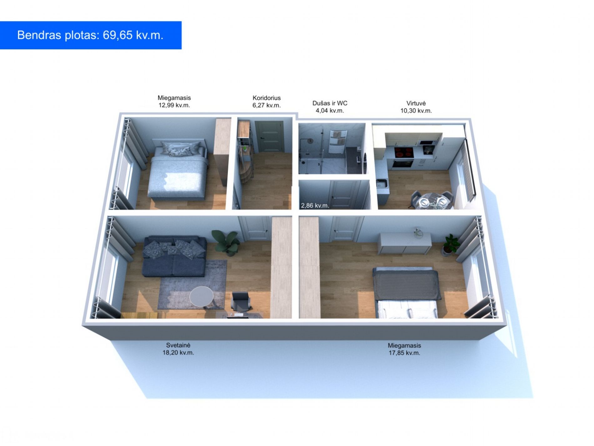 ➢ Butą sudaro trys atskiri kambariai ir erdvi virtuvė;