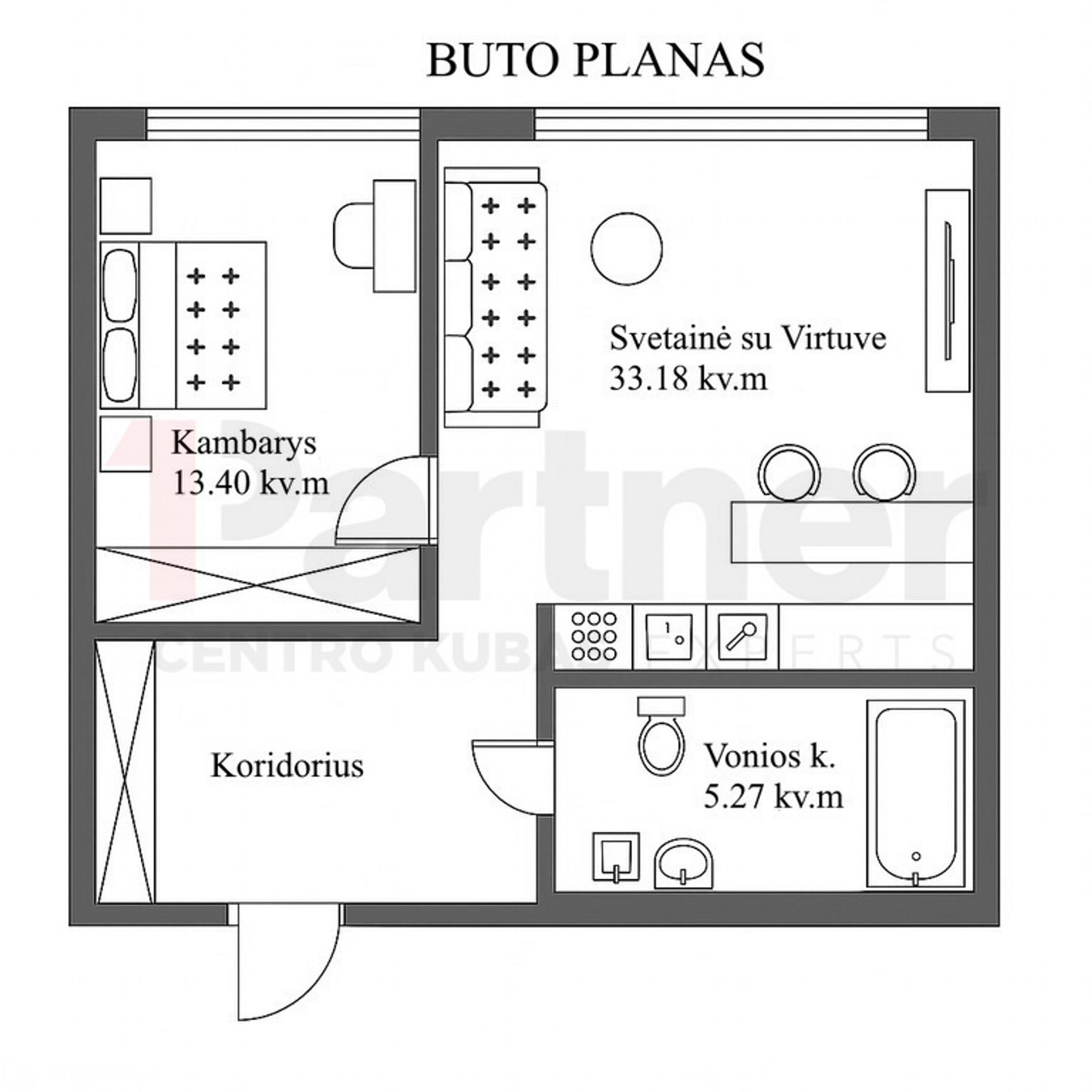 • Funkcionalus išplanavimas – erdvi svetainė su virtuvės zona, atskiras miegamasis, koridorius ir vonios kambarys;
