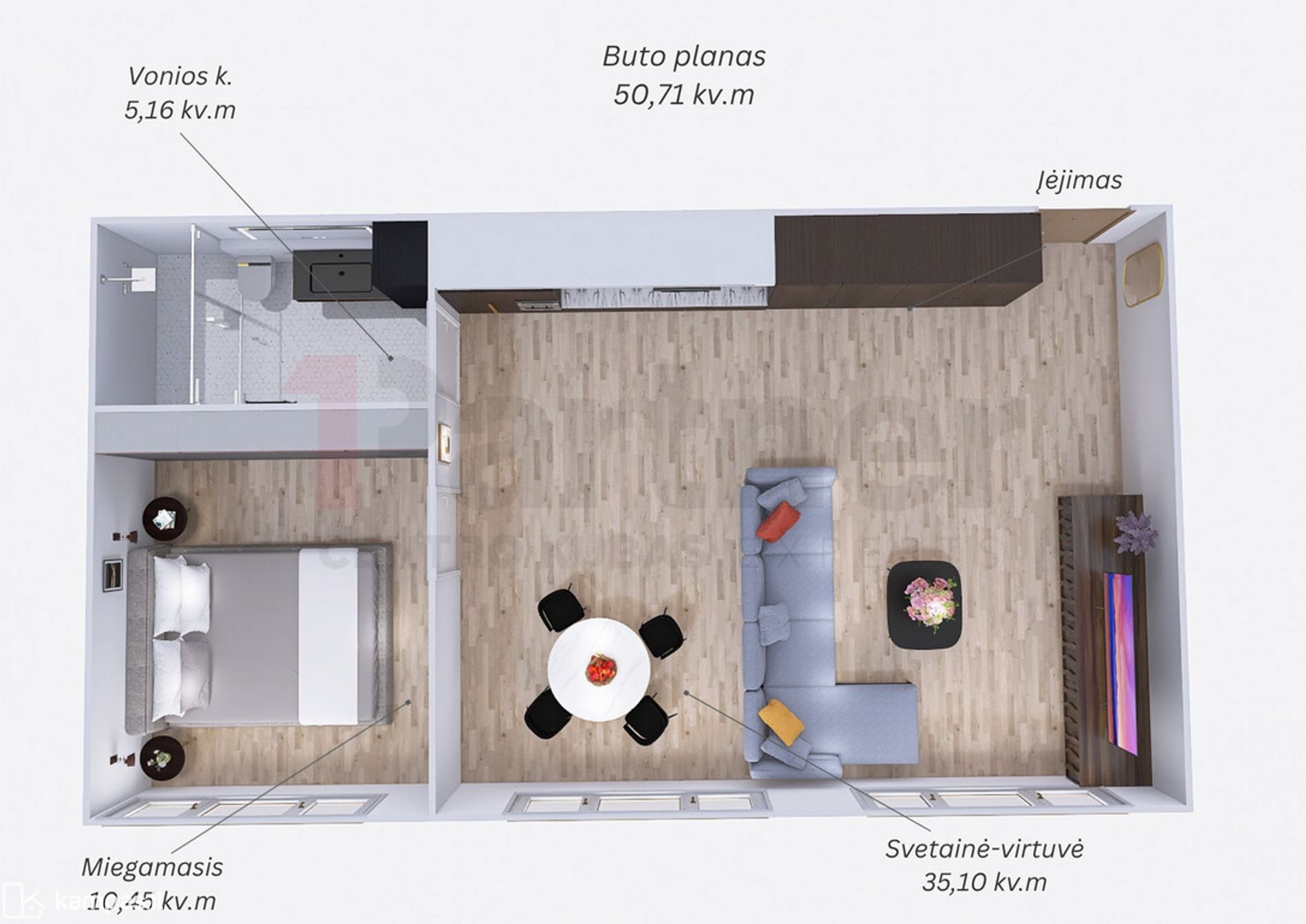 • Virtuvės ir svetainės erdvė - 35,10 kv.m.