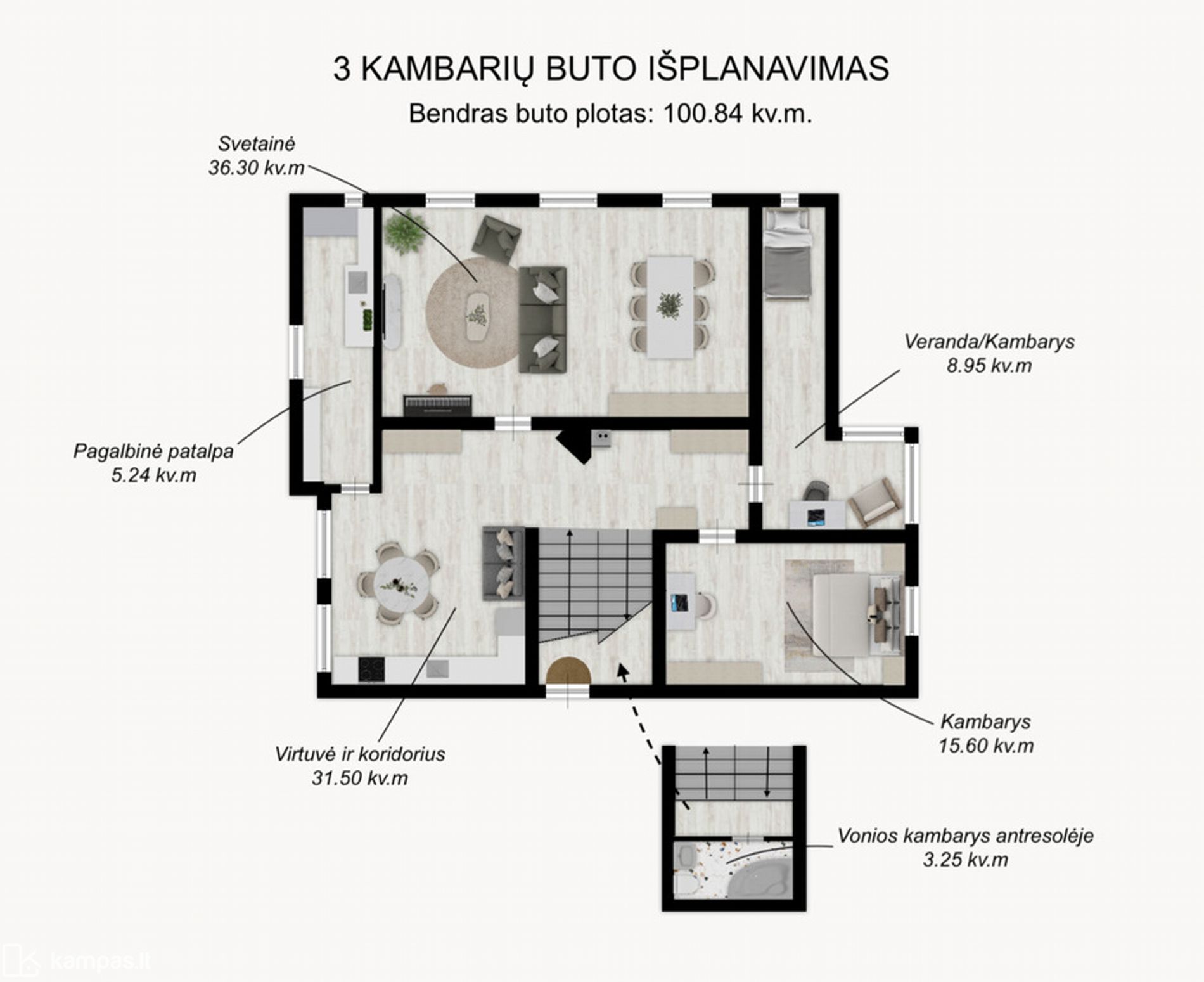 • Bendras plotas - 149,08 kv.m(100,84 butas + 48,24 palėpė);