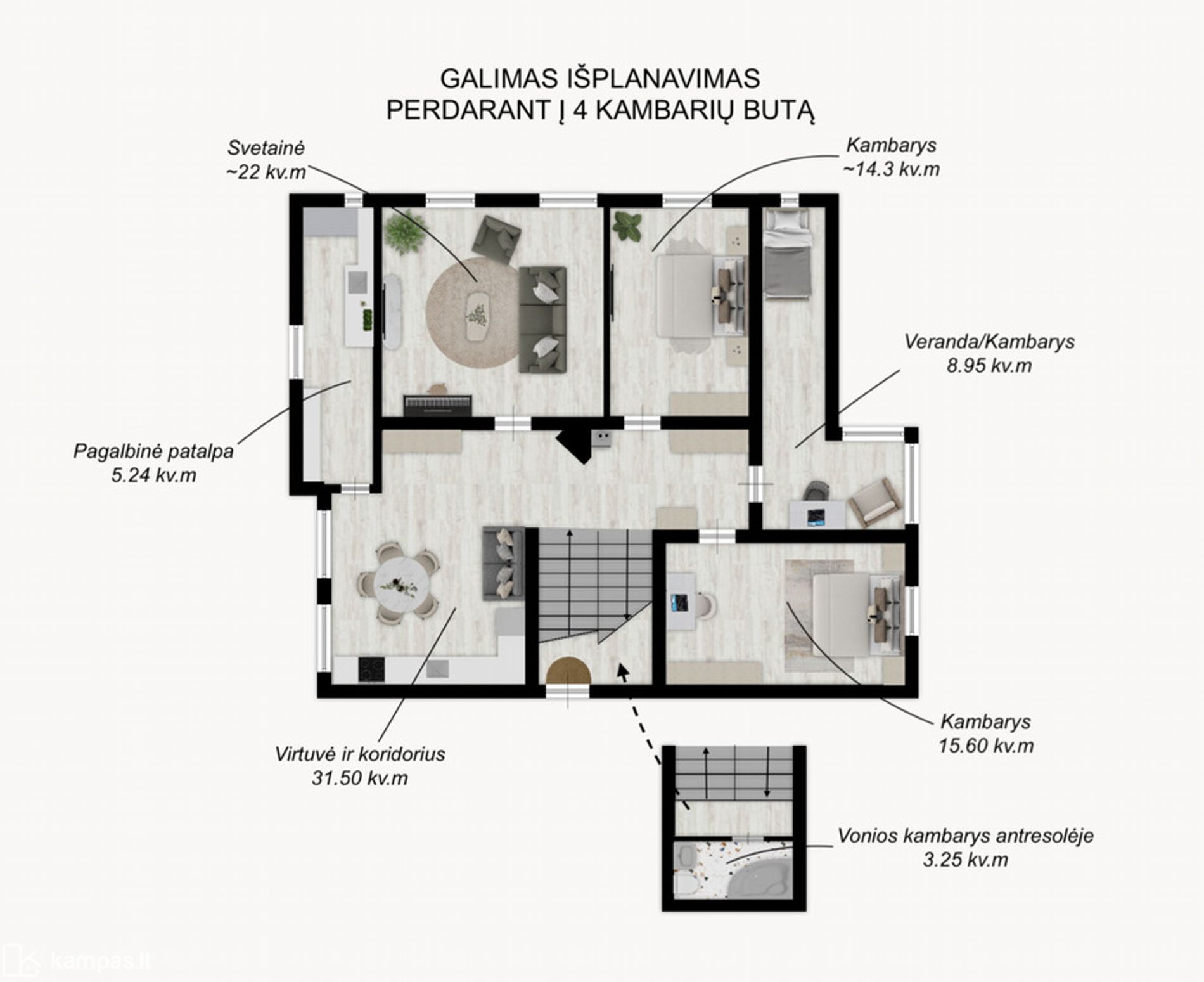 Yra galimybė perdaryti į 4 kambarių butą, be to įrengti palėpę.