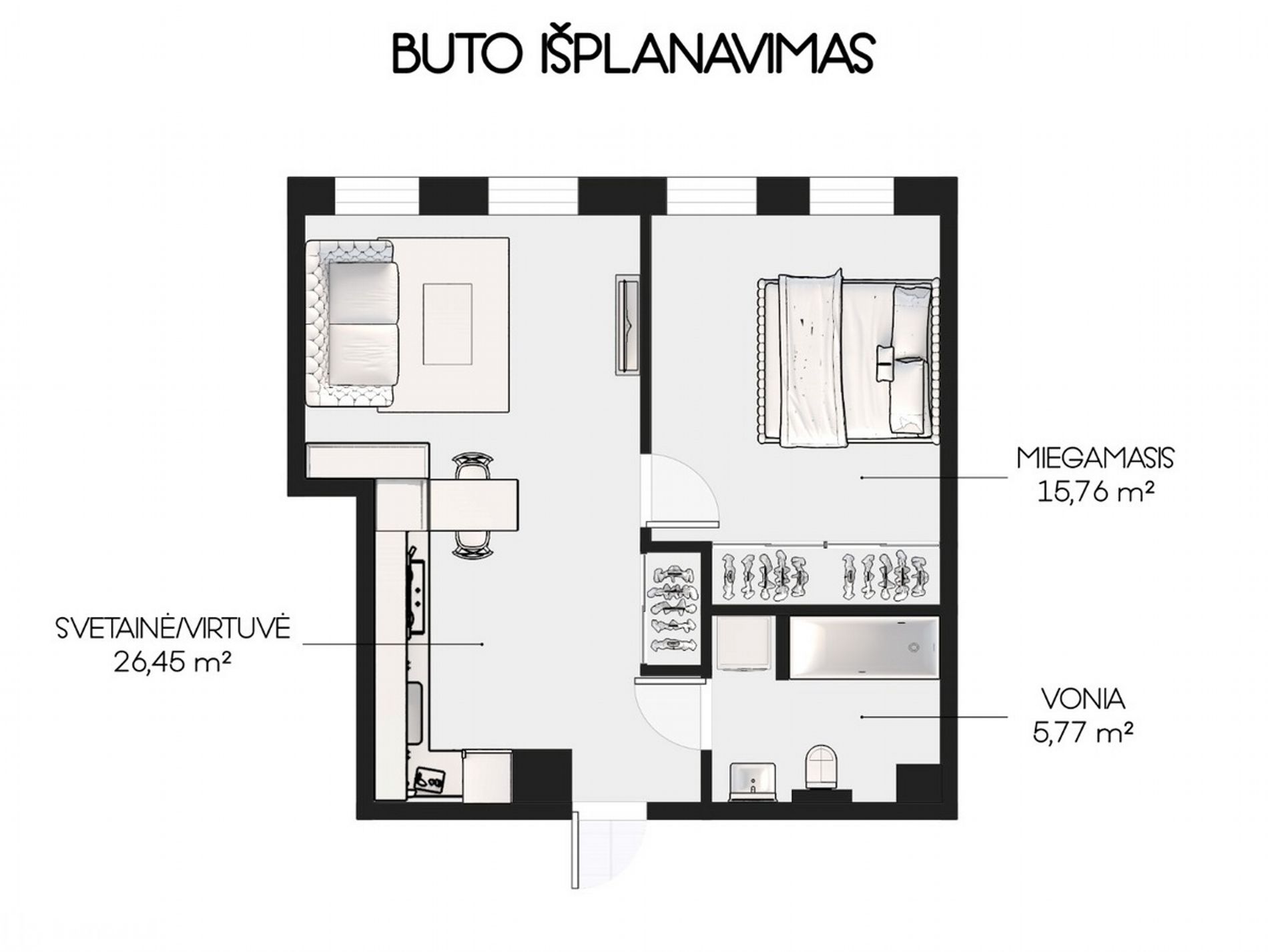 - Butas įrengtas kokybiškomis apdailos medžiagomis ir baldais;