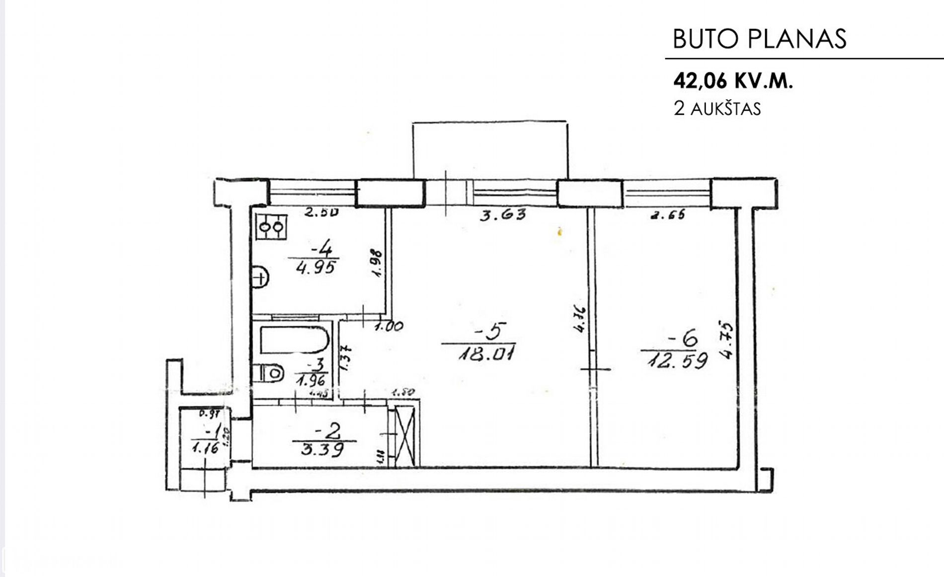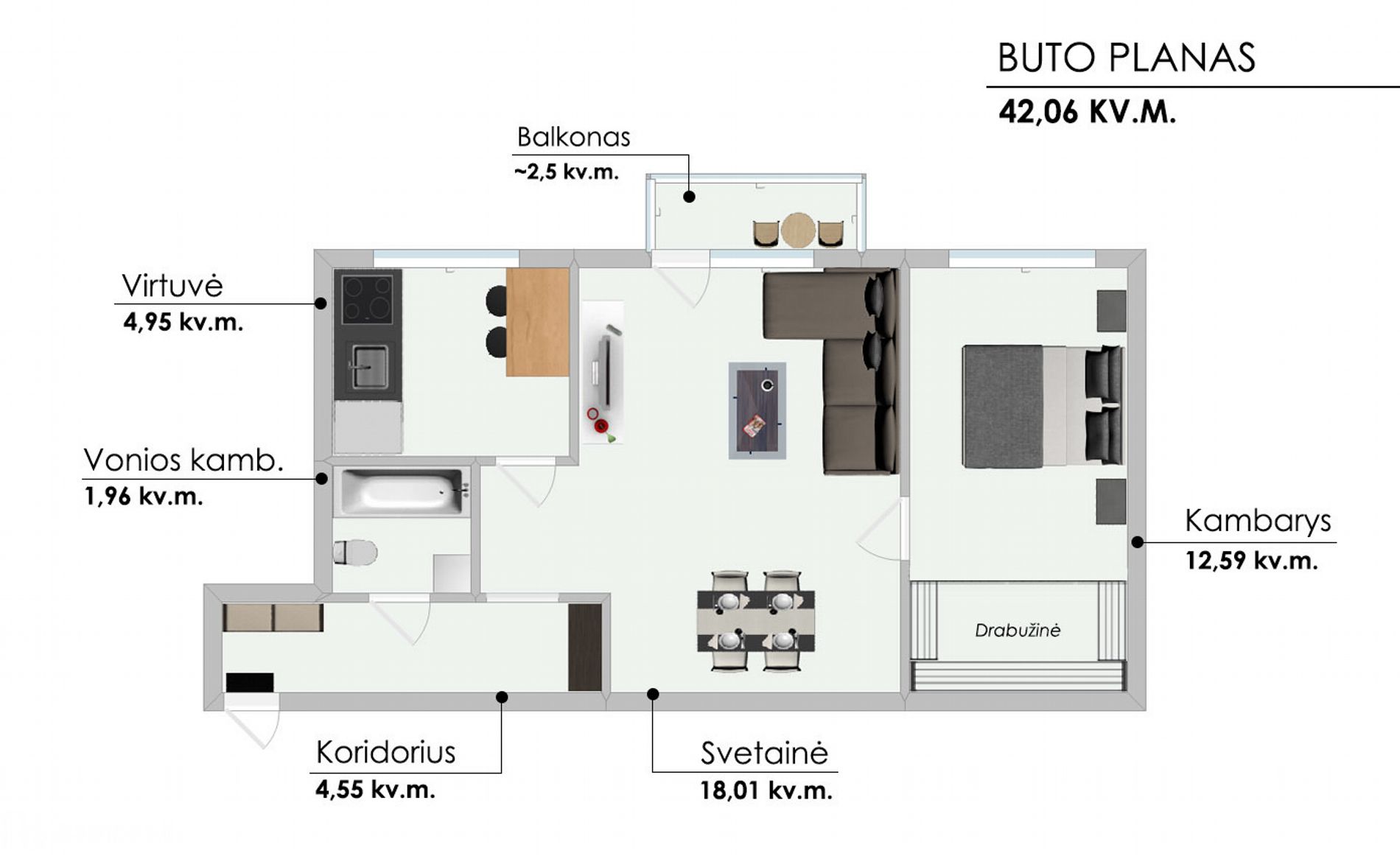- Bendras plotas: 42.06 kv.m;