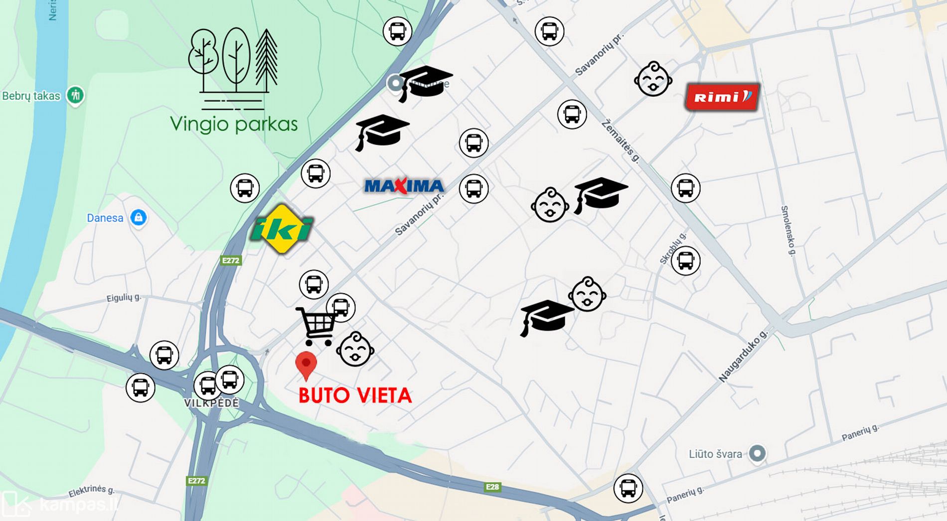 - Puikiai išvystyta infrastruktūra: aplink gausu įvairių vaikų darželių, mokyklų, maisto prekių parduotuvės, viešojo transporto stotelės;