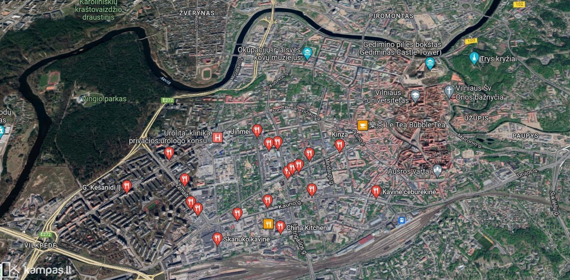 • Netoliese – kavinės, barai, naktiniai klubai, degalinė.