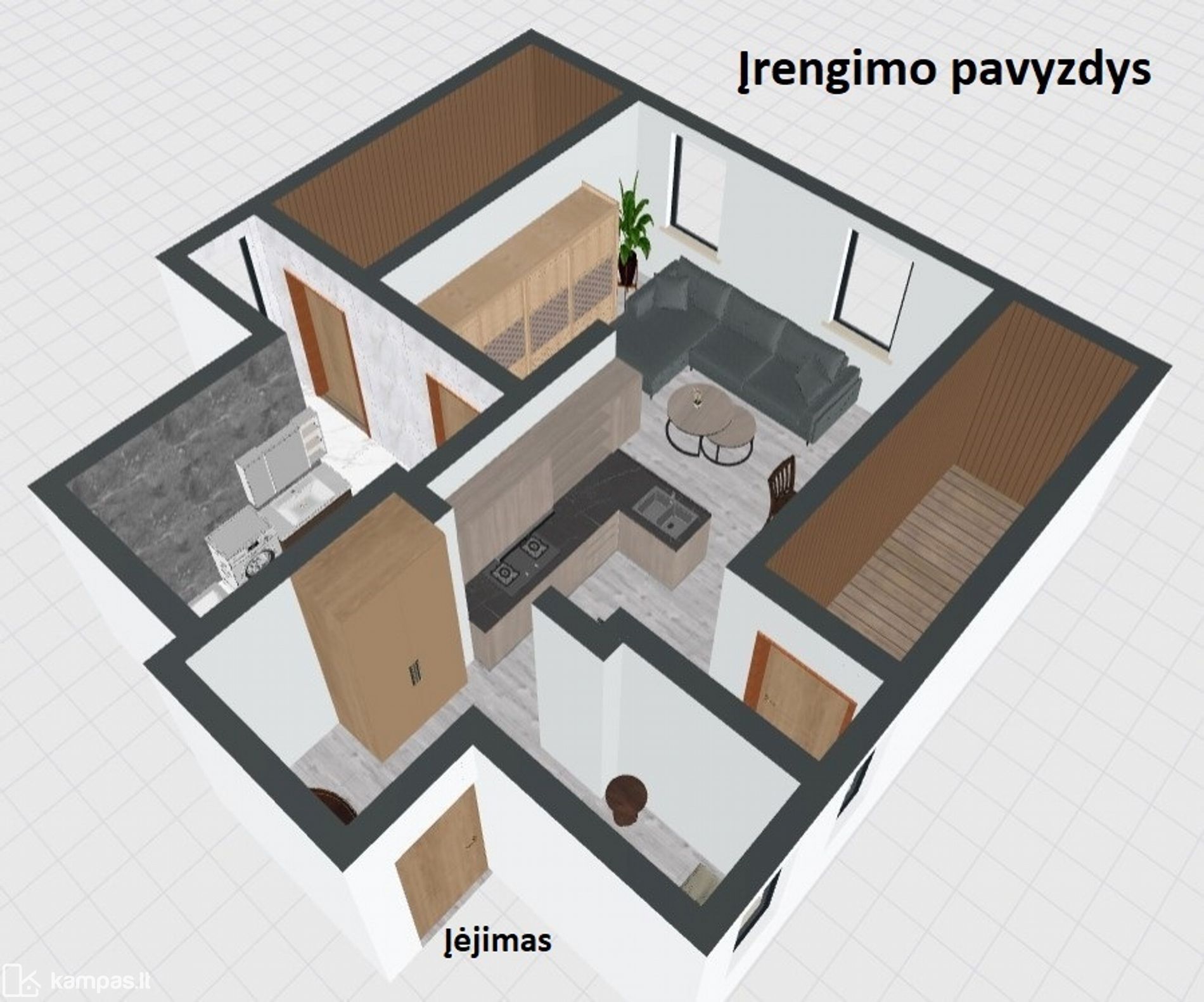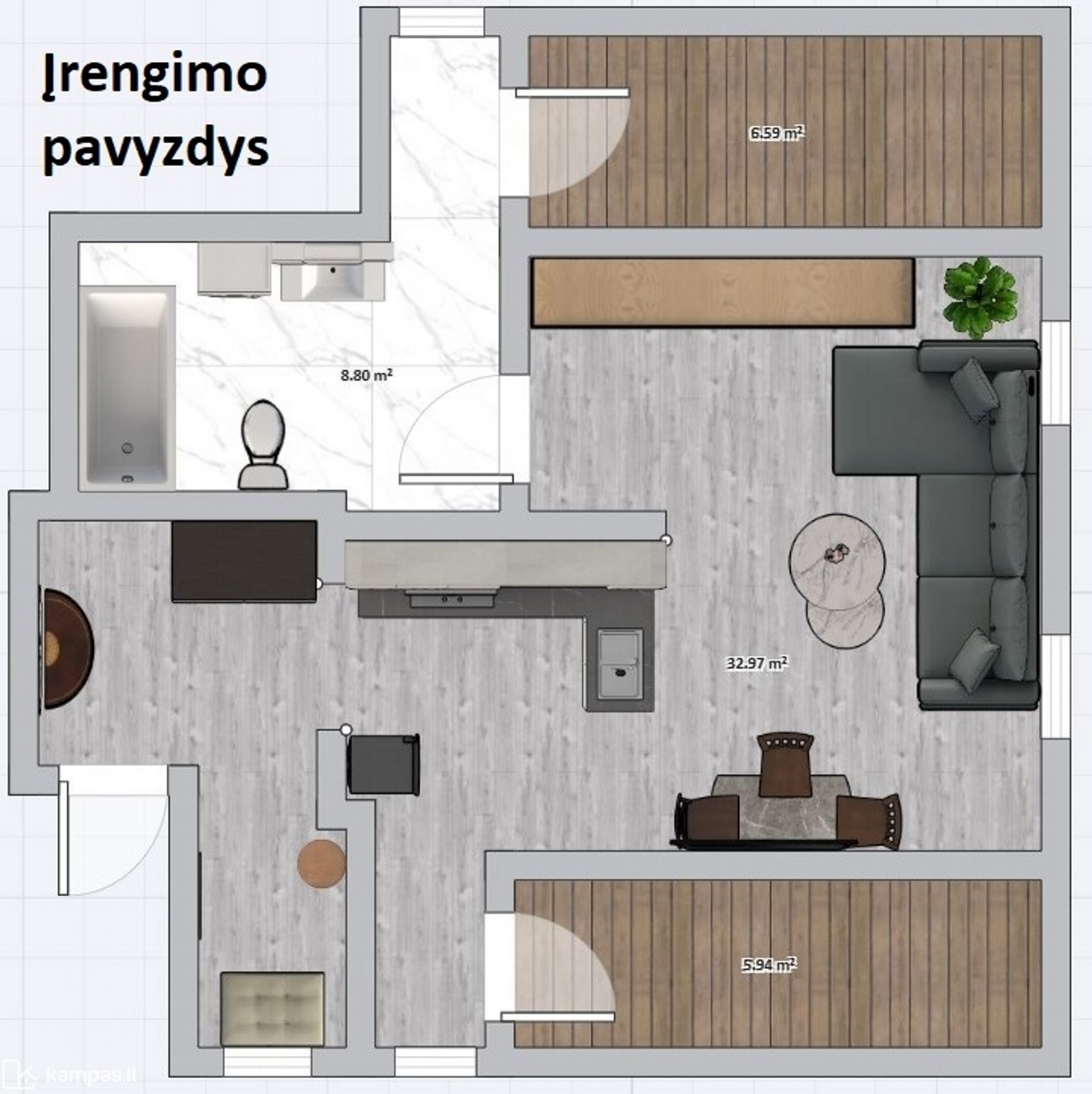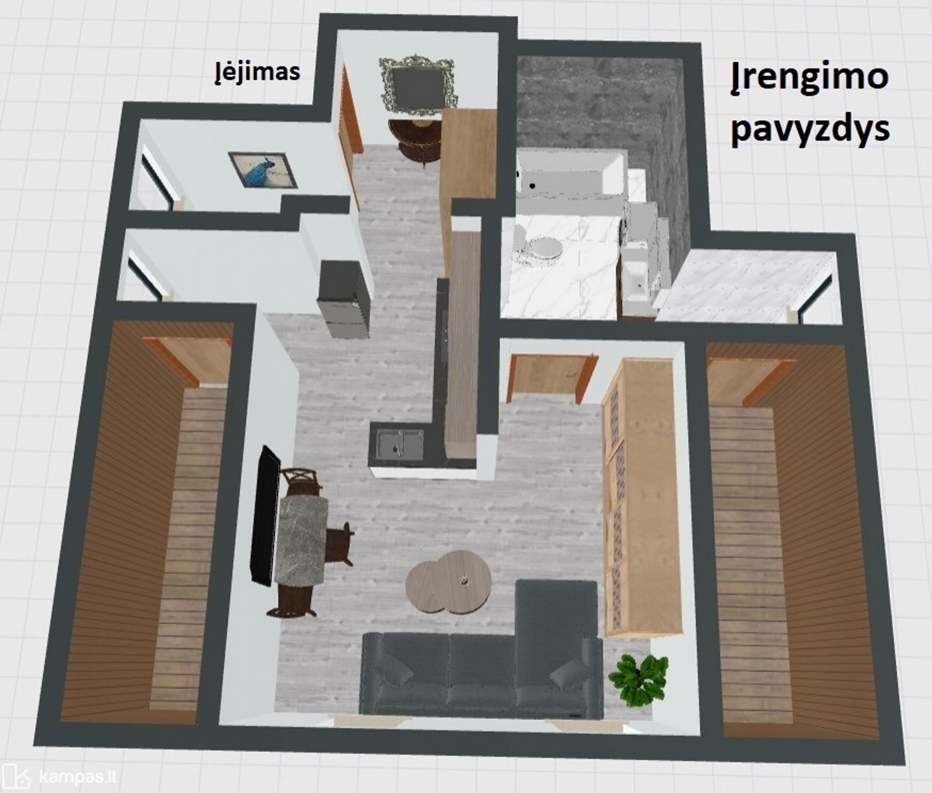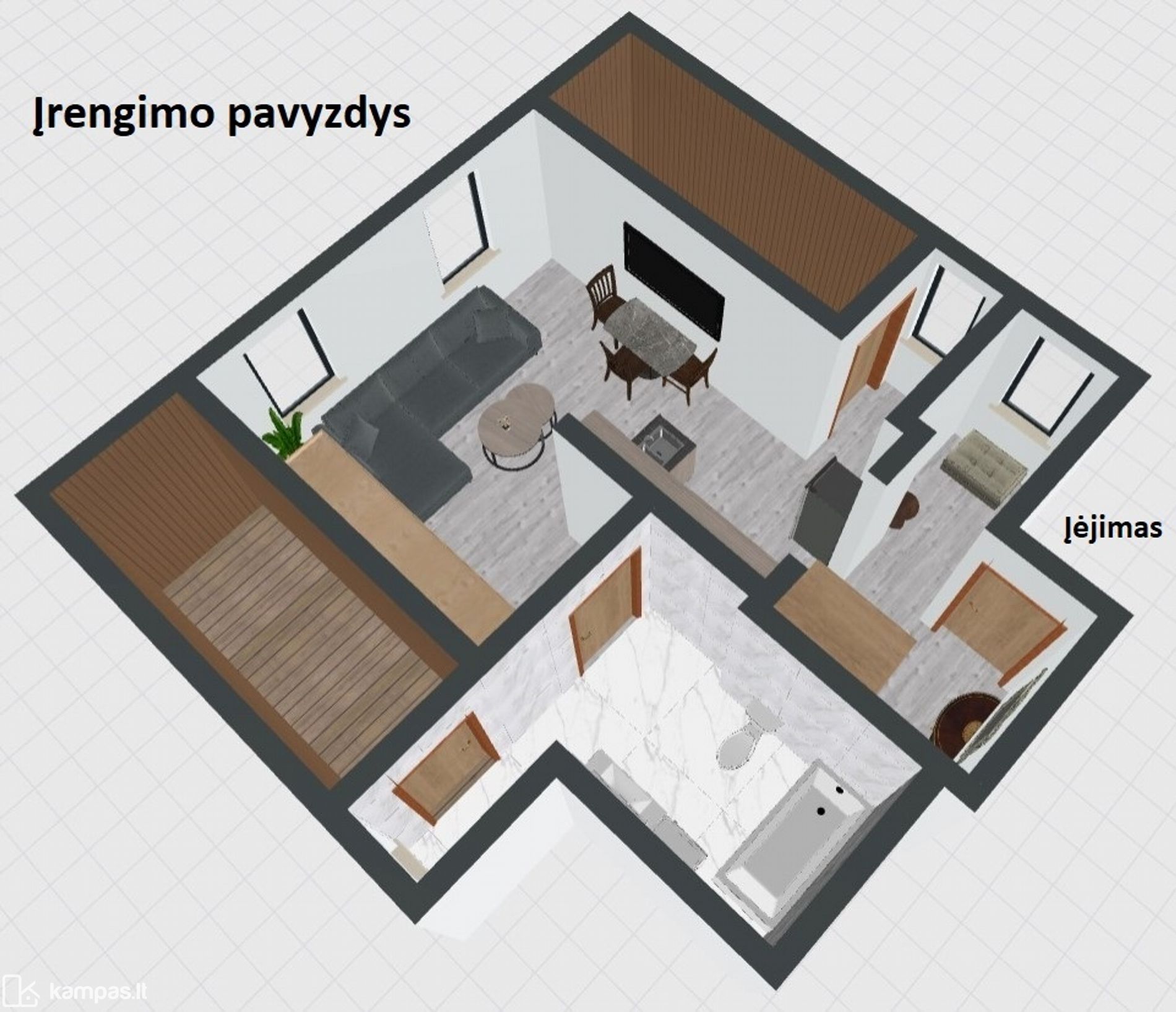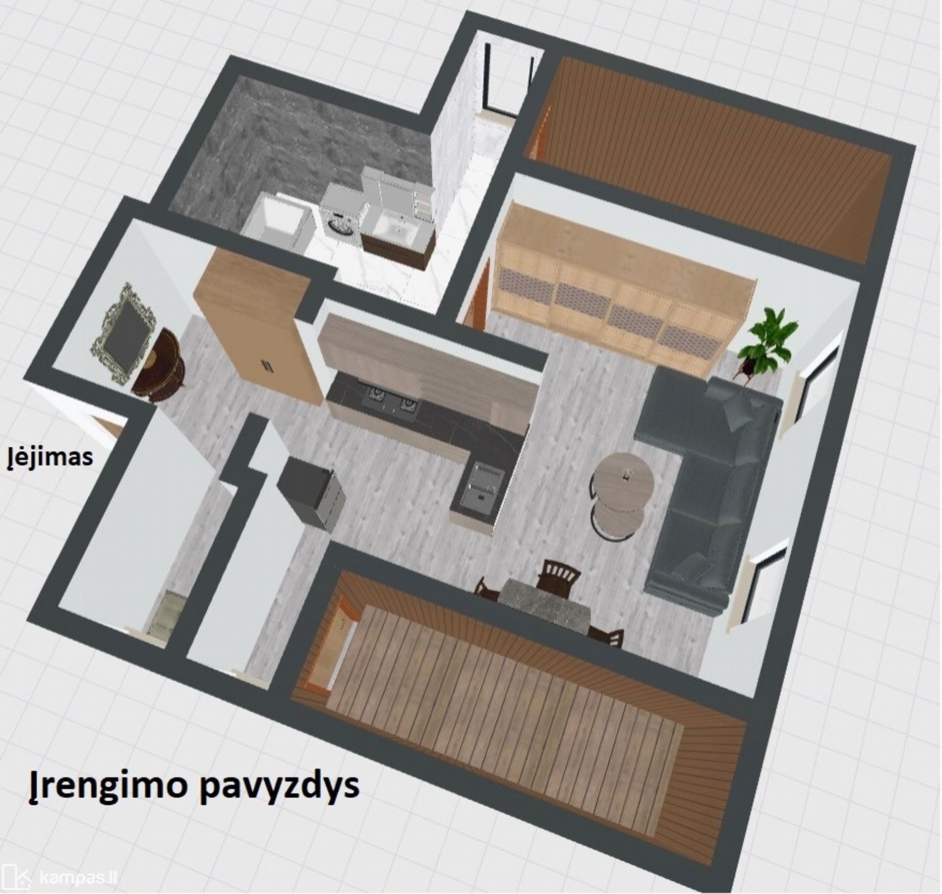 - Butas kompaktiškas, nesudėtingai pertvarkomas, yra vieta įrengti didelį vonios kambarį;