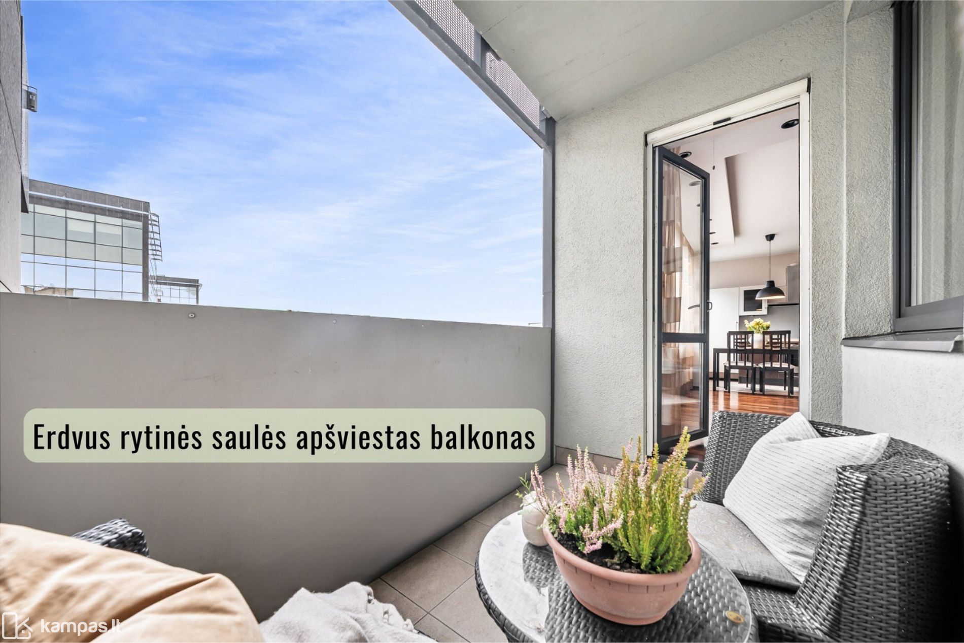 • Erdvus rytinės saulės apšviestas balkonas, iš kurio atsiveria gyvenamųjų rajonų panorama;