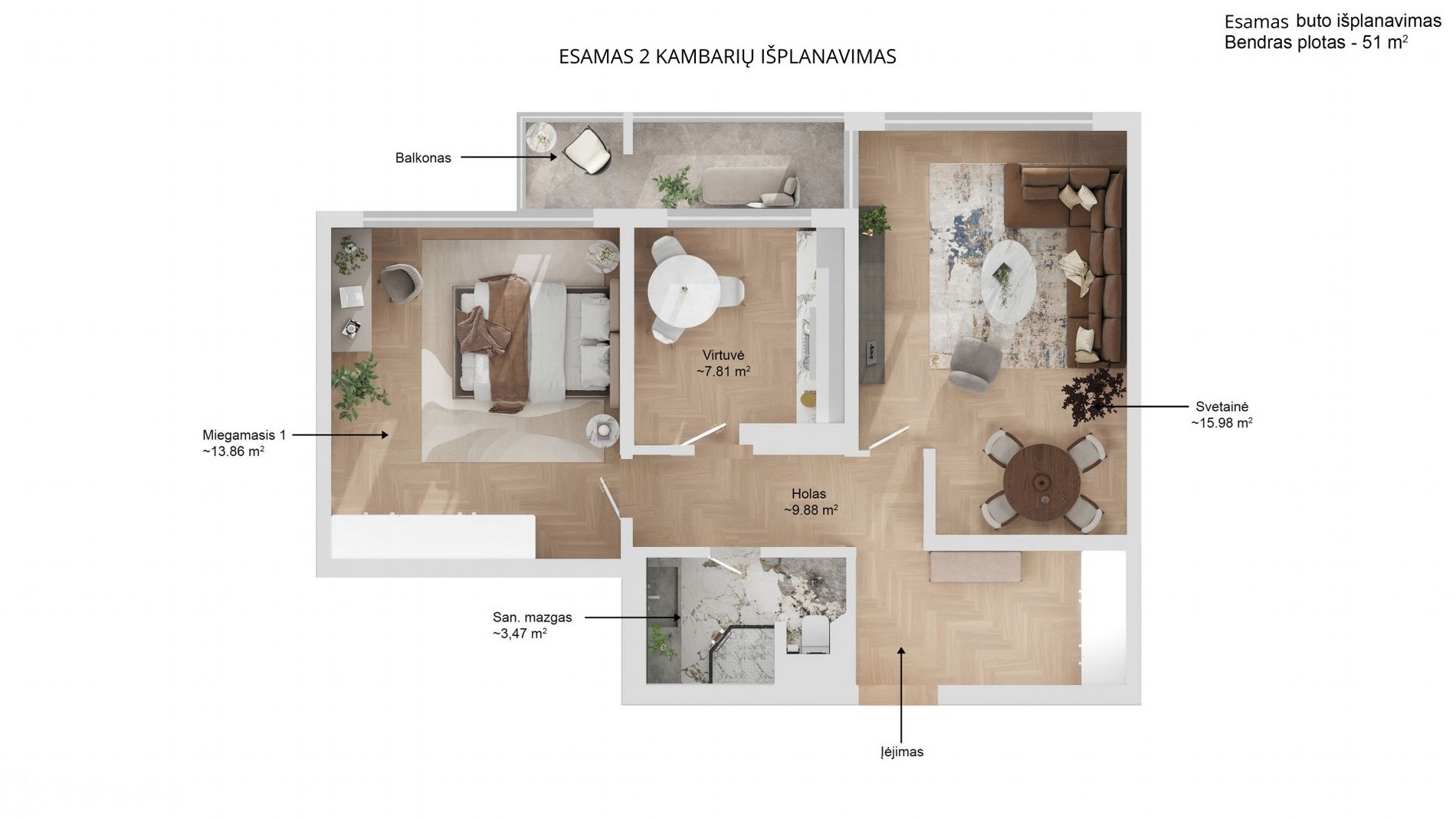 ➢ Patogus buto išplanavimas – atskira virtuvės zona, svetainė ir miegamasis