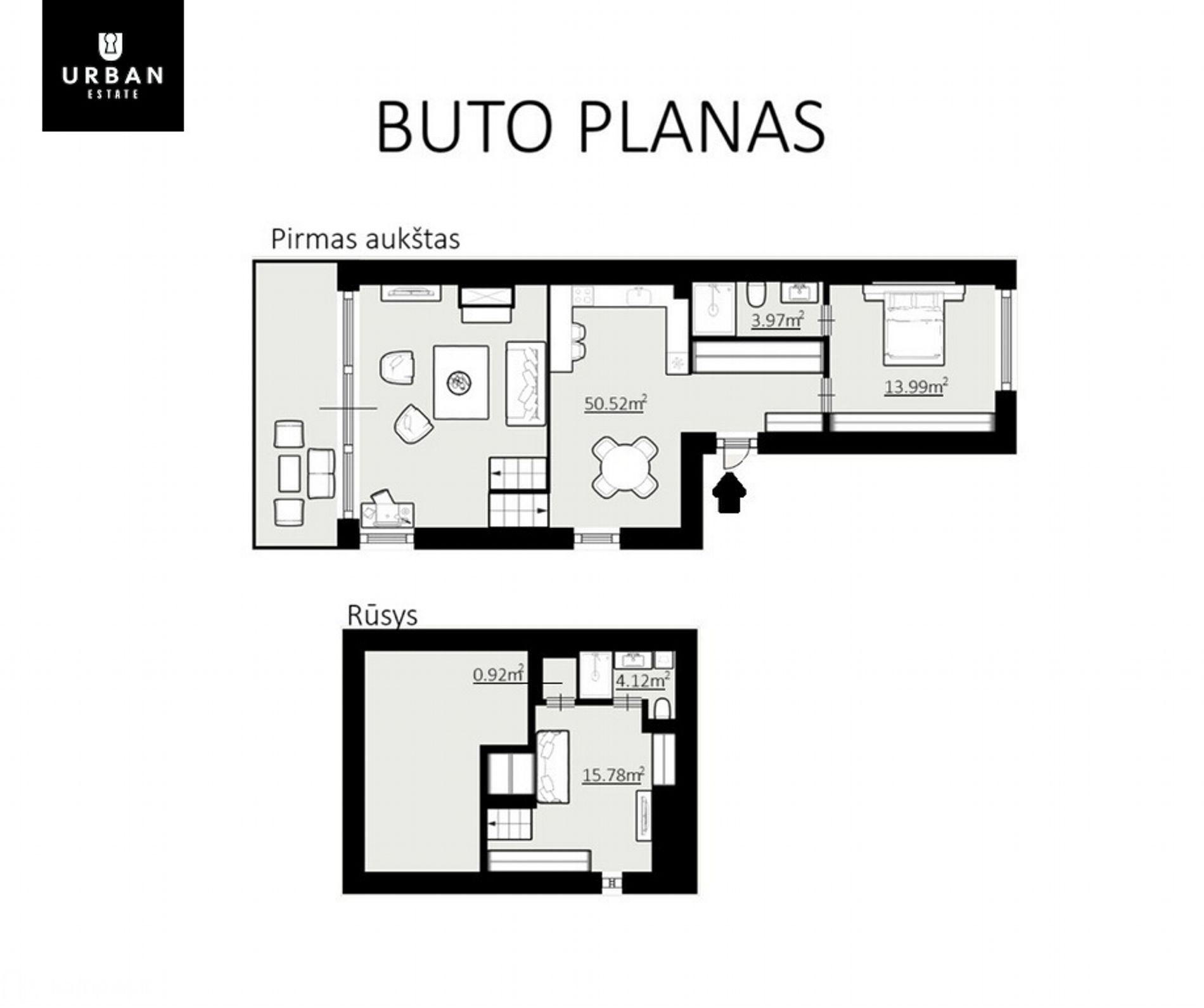• Vonios kambariai įrengti abiejuose buto aukštuose.