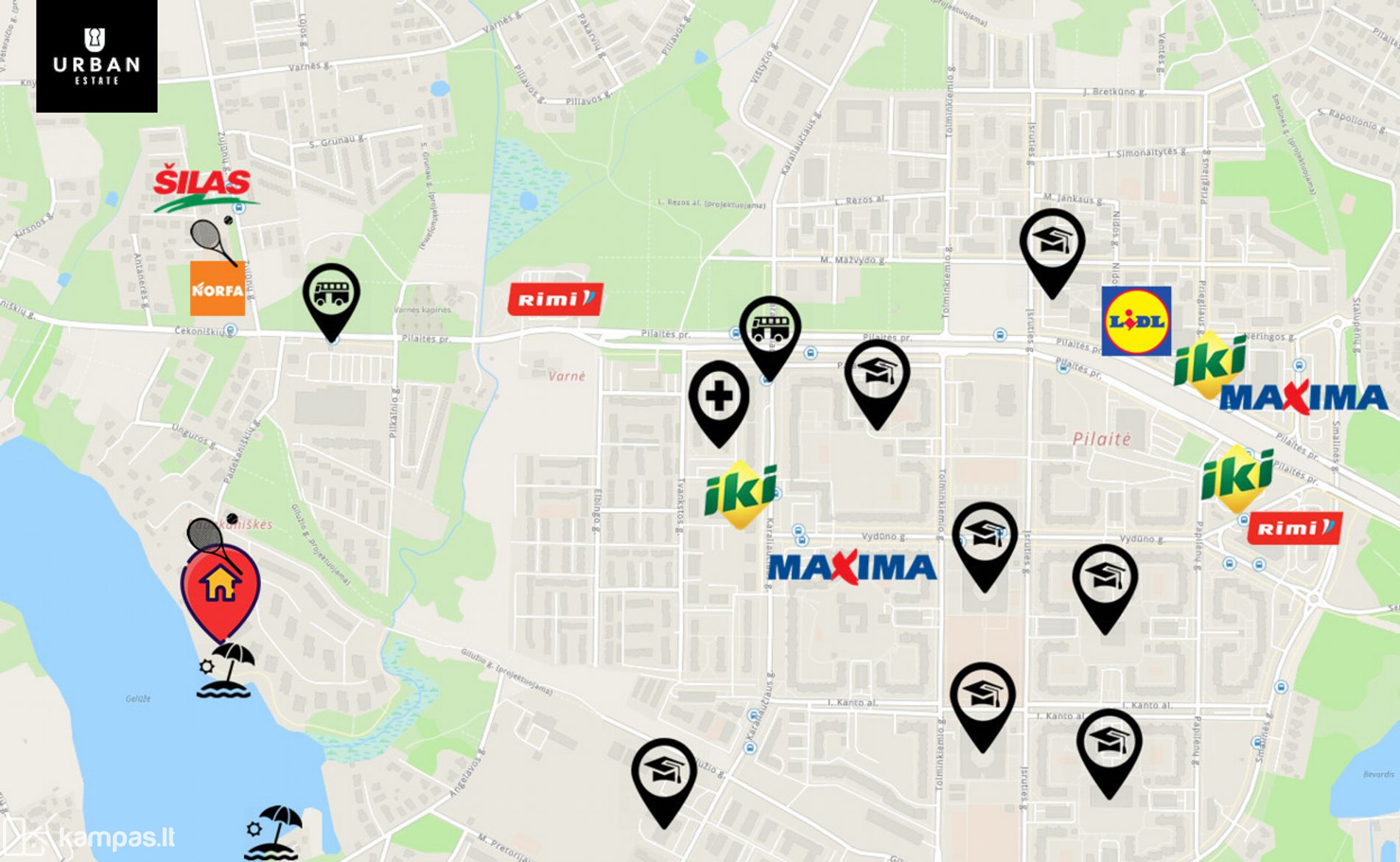 • Nors įsikursite vaizdingoje gamtos apsuptyje, kvartalas pasižymi ir puikia infrastruktūra: netoliese – viešojo transporto stotelės, parduotuvės, mokyklos, darželiai ir gydymo įstaigos. Miesto centrą pasieksite per keliolika minučių tiek automobiliu, tiek viešuoju transportu.