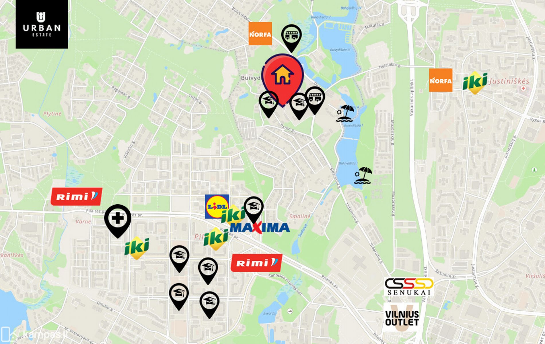 - Pro kvartalą kursuoja viešasis transportas. Kelių kilometrų spindulių rasite visus reikalingus objektus, prekybos ir laisvalaikio centrą "Vilnius outlet".