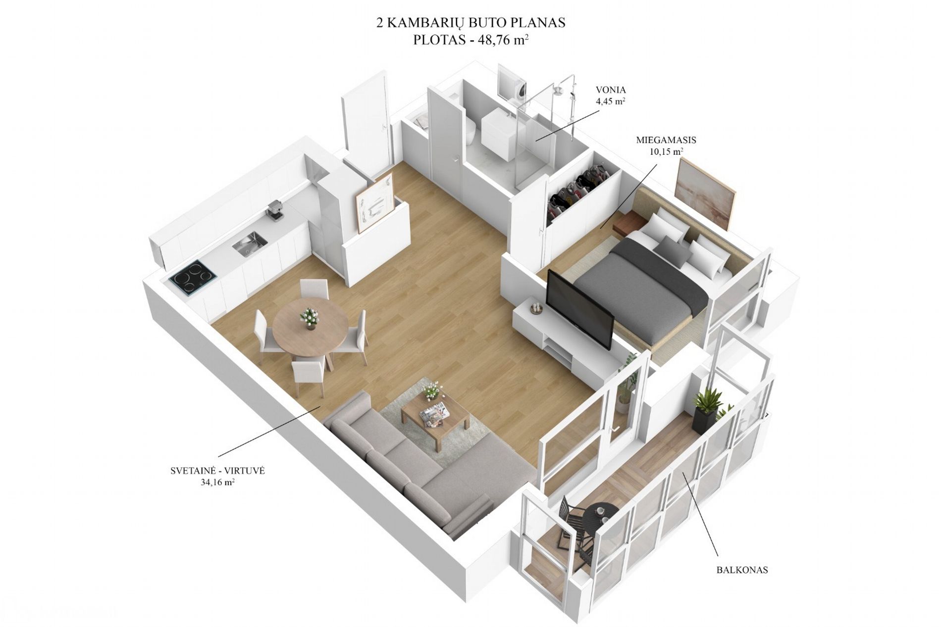• Erdvus balkonas ~ 6 kv.,m (į buto kvadratūra neįskaičiuotas).