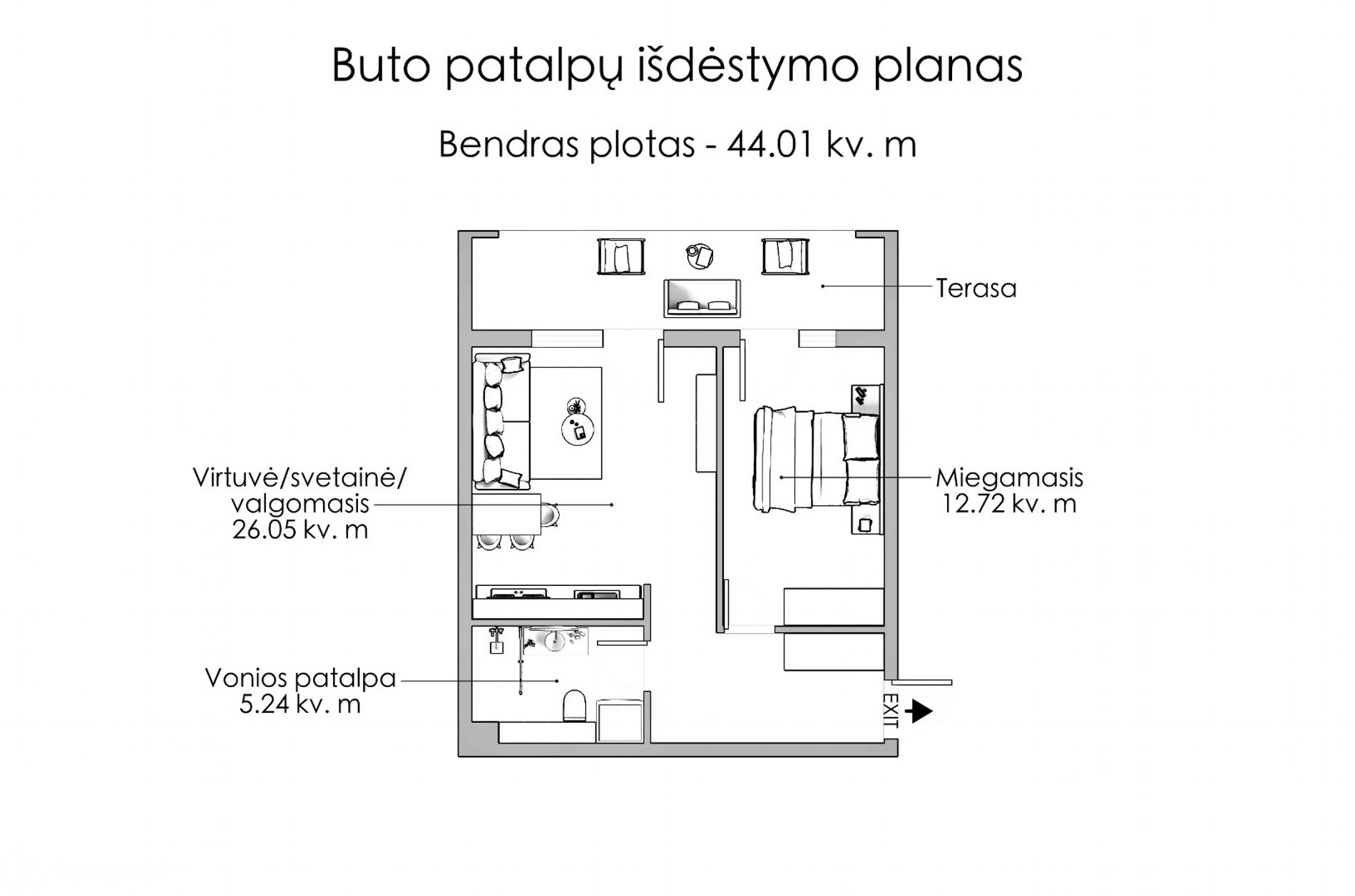 • Funkcionalus buto išplanavimas: erdvi, šviesi svetainės ir virtuvės zona, atskiras ir jaukus miegamasis, patogus ir apgalvotas vonios kambarys, erdvus kiemelis su terasa;