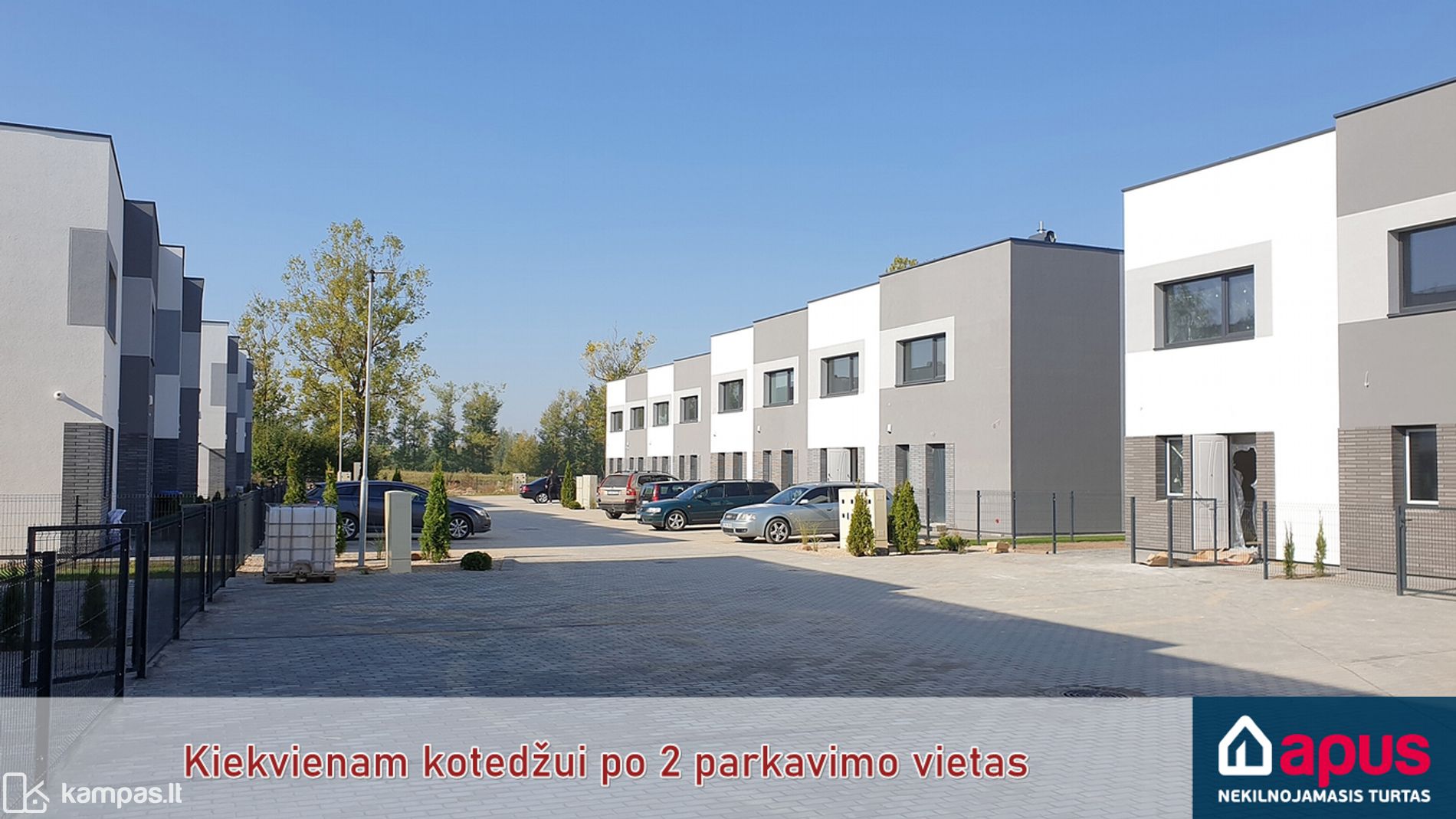 • Kiekvienam kotedžui trinkelėmis grįsta aikštelė 2 automobiliams.
