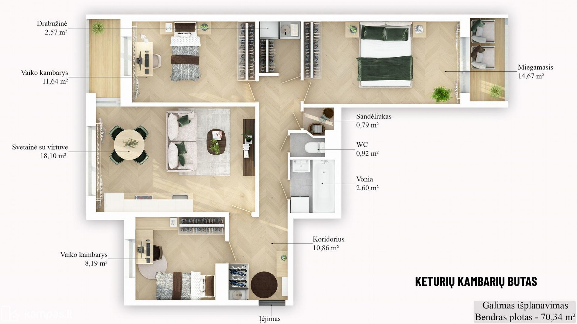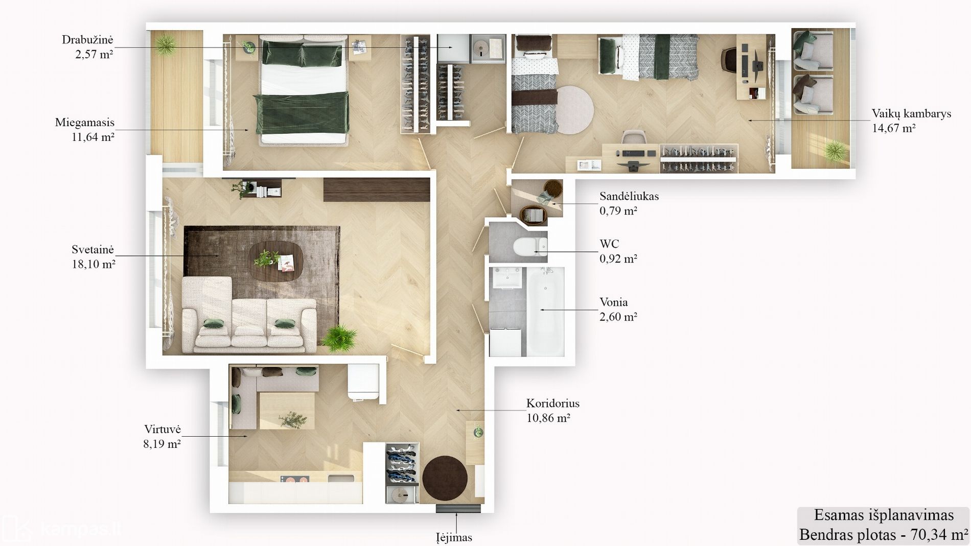 ESAMAS IŠPLANAVIMAS 3 KAMBARIAI (bendras plotas – 70,34 kv. m):