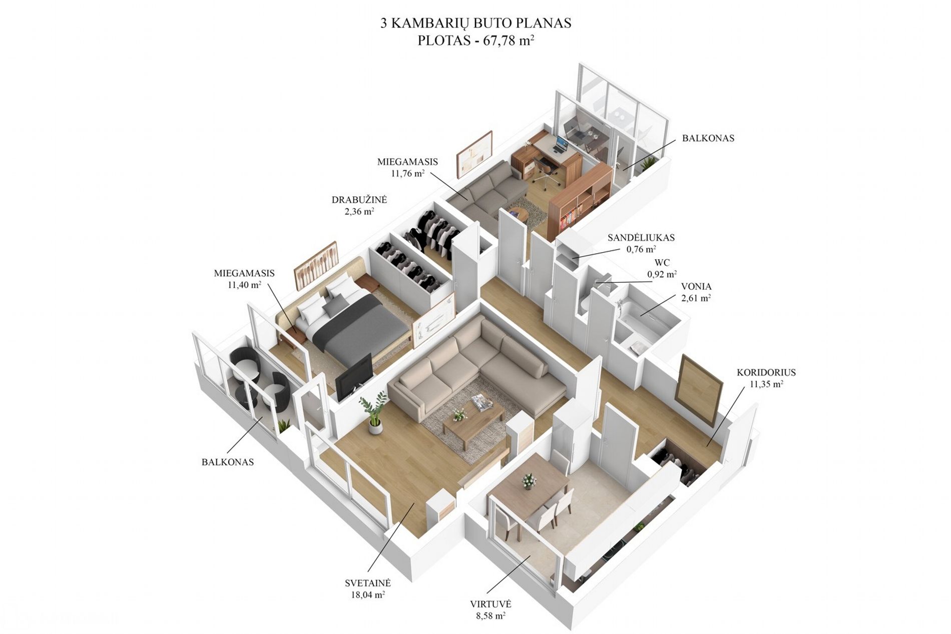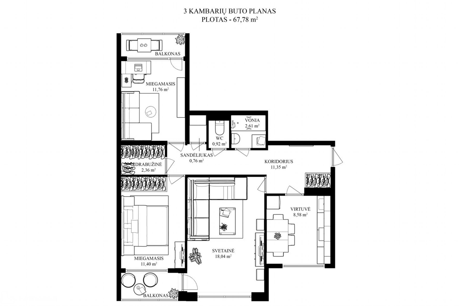 - Patogus buto išplanavimas: erdvi svetainė, atskira virtuvė, jaukūs miegamieji, drabužinė, 2 įstiklinti balkonai;