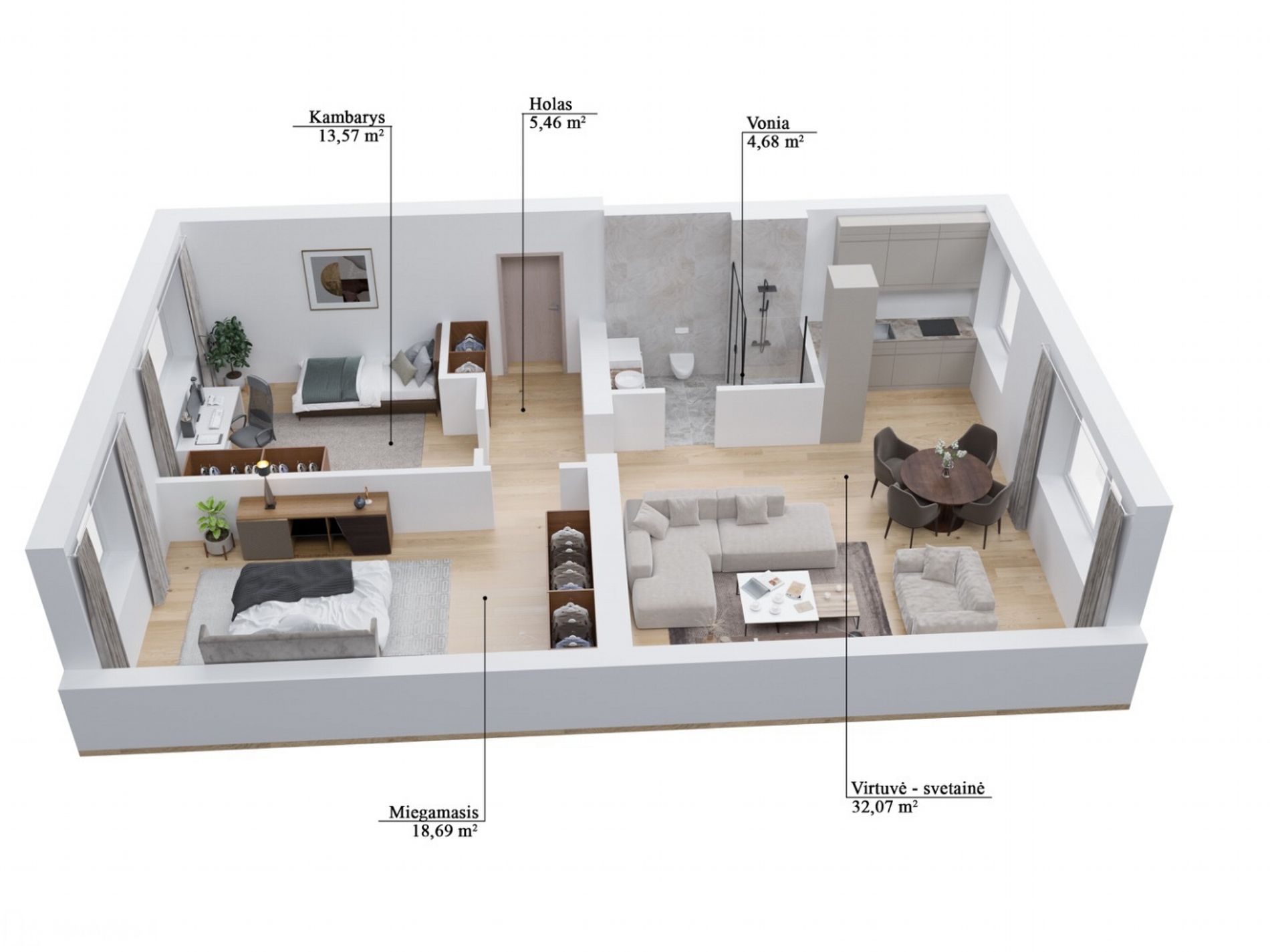 - Patogumas ir erdvė: 2 erdvūs miegamieji ir svetainė, sujungta su virtuve – puikus sprendimas šeimai ar tiems, kurie mėgsta draugišką, atvirą erdvę.