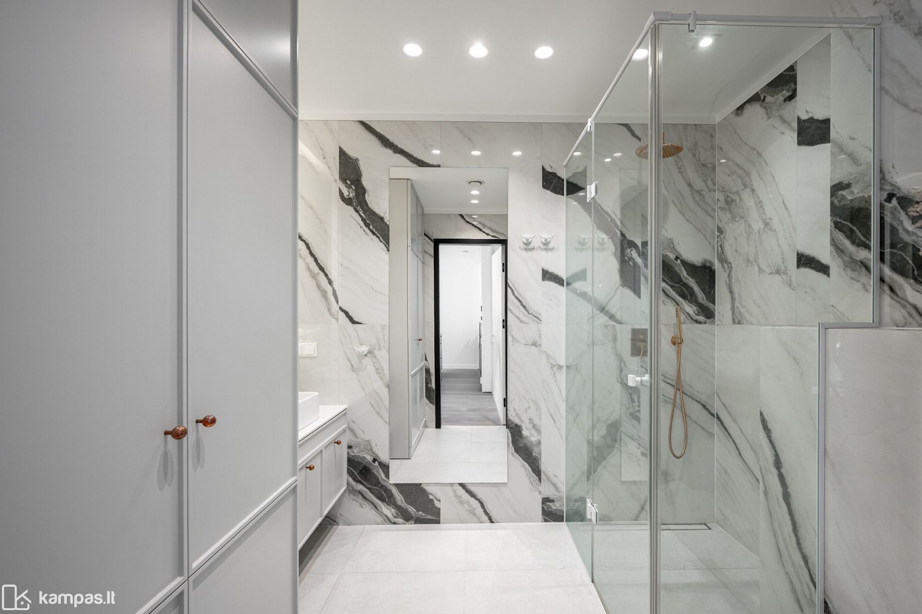 • Sienos – dažytos, vonios kambaryje – akmens masės plytelės;