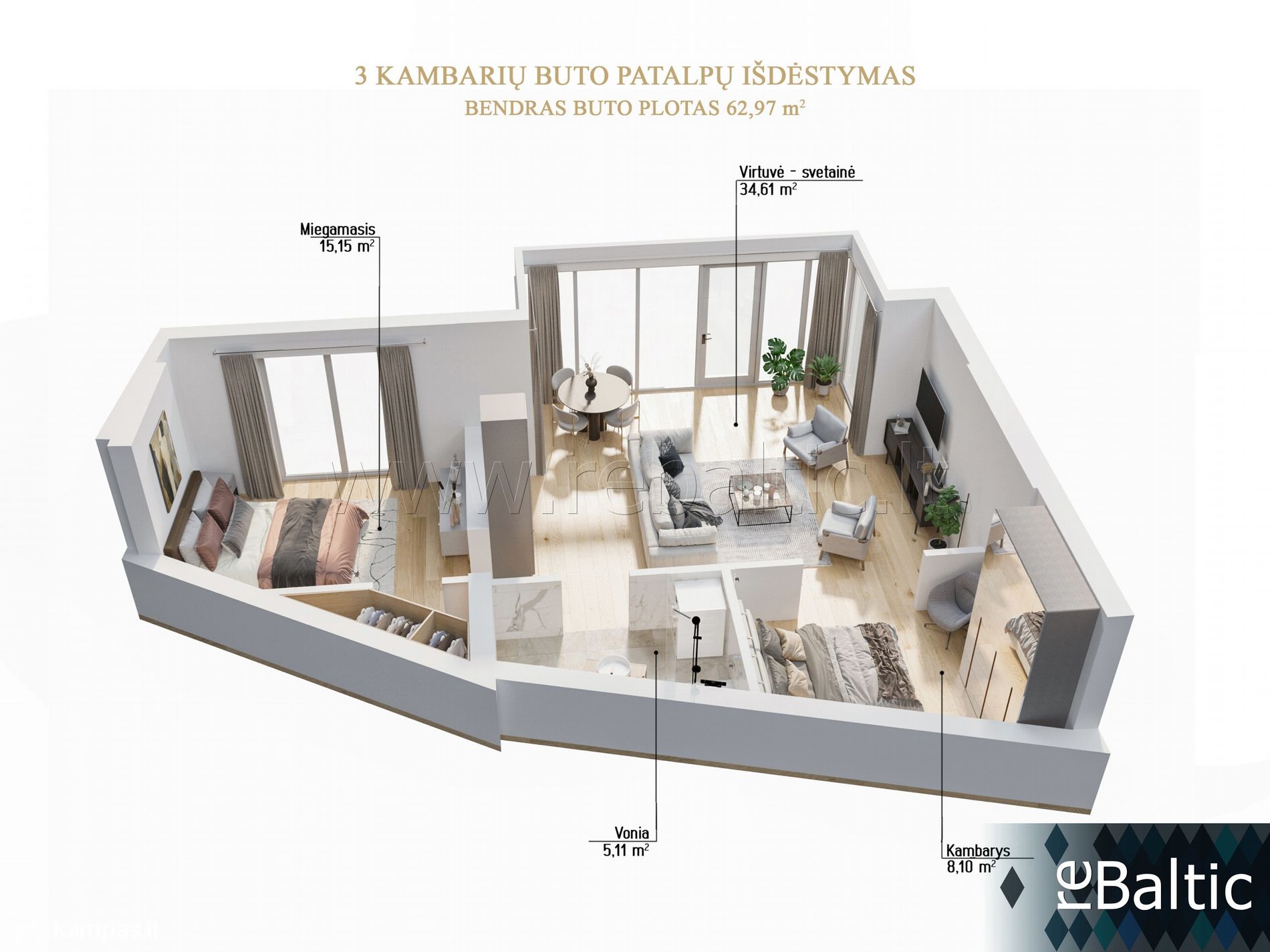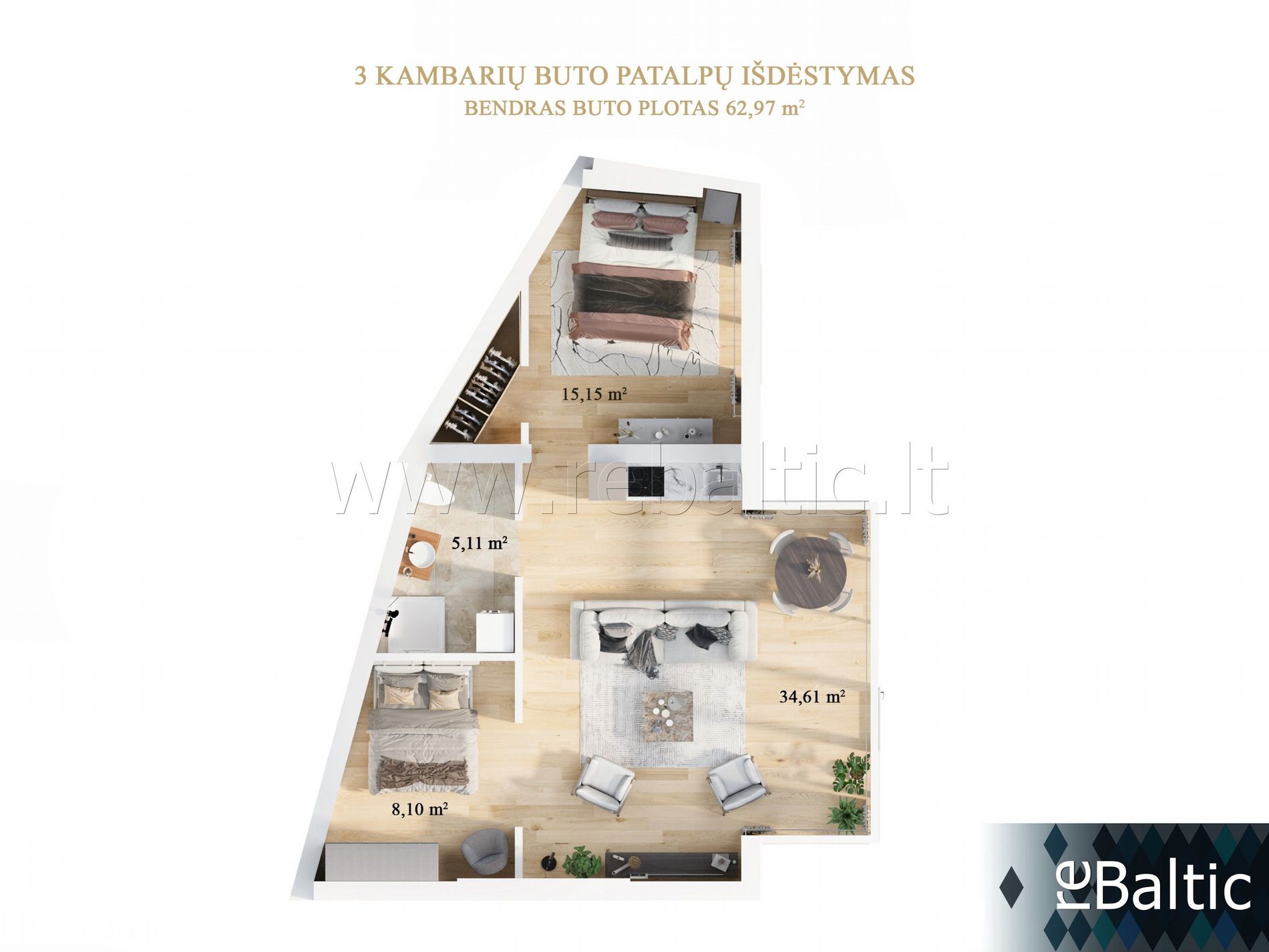 - Puikus buto išdėstymas leido 63 kv.m plote sutalpinti du miegamuosius kambarius