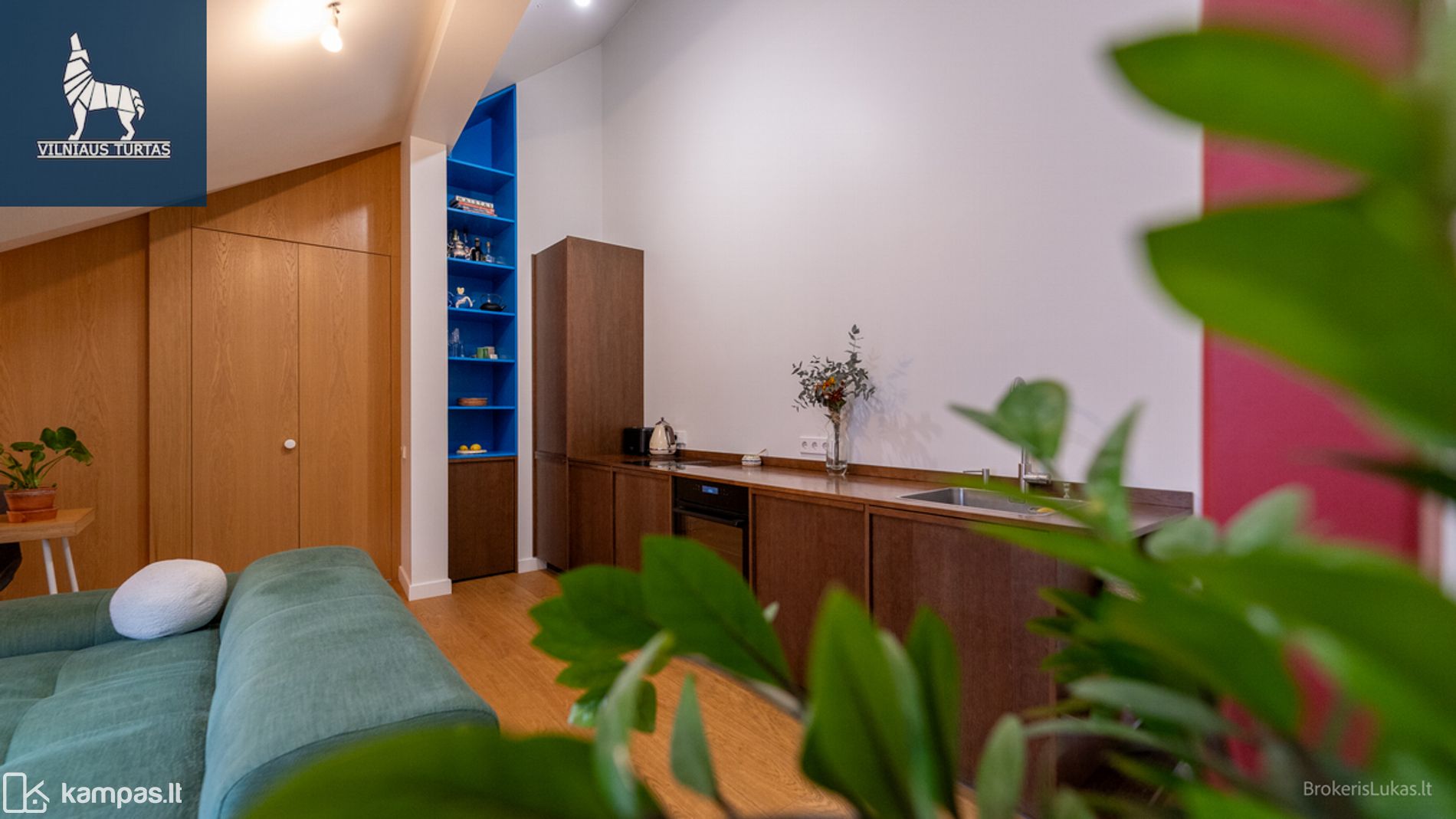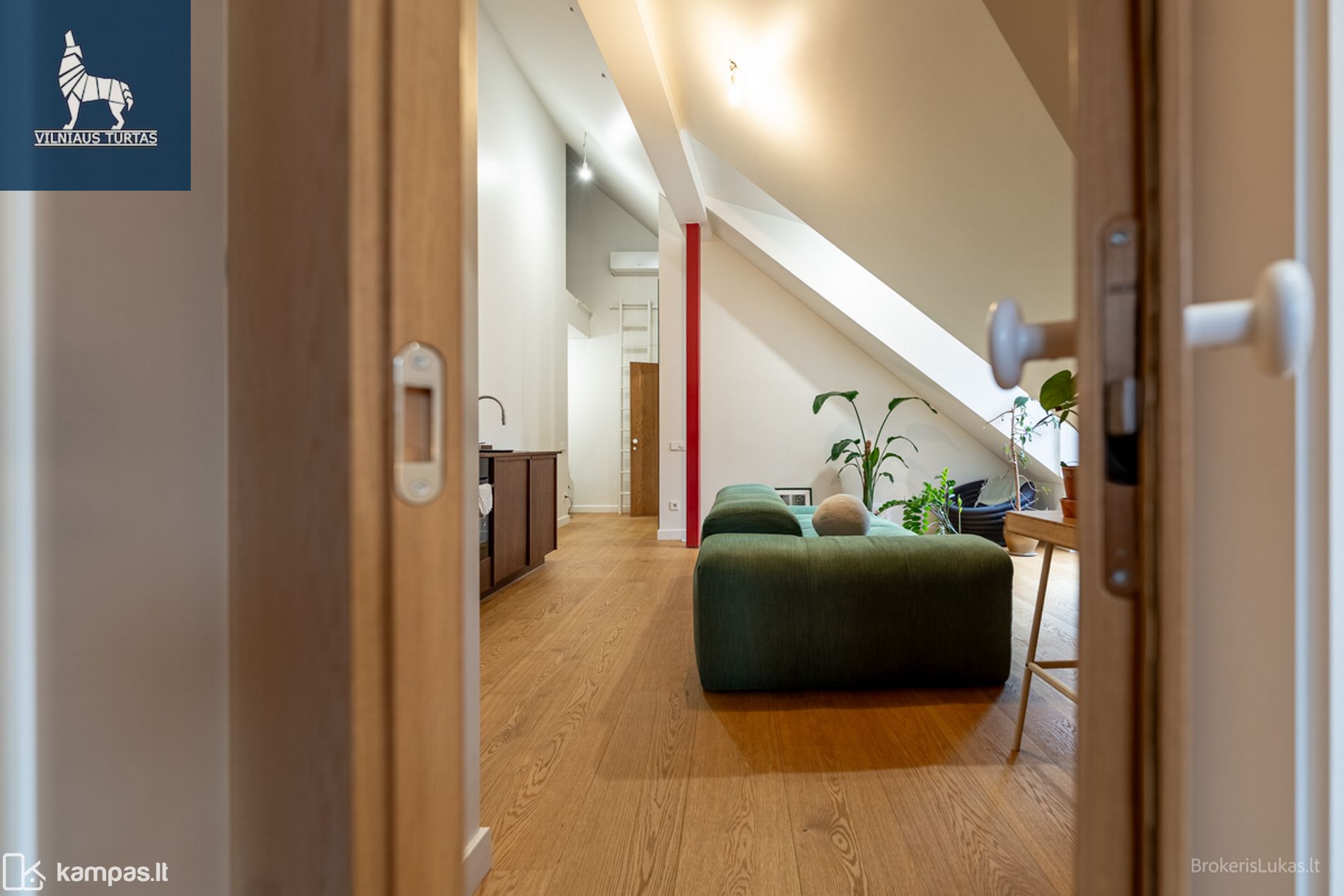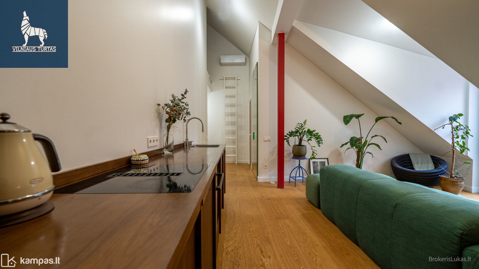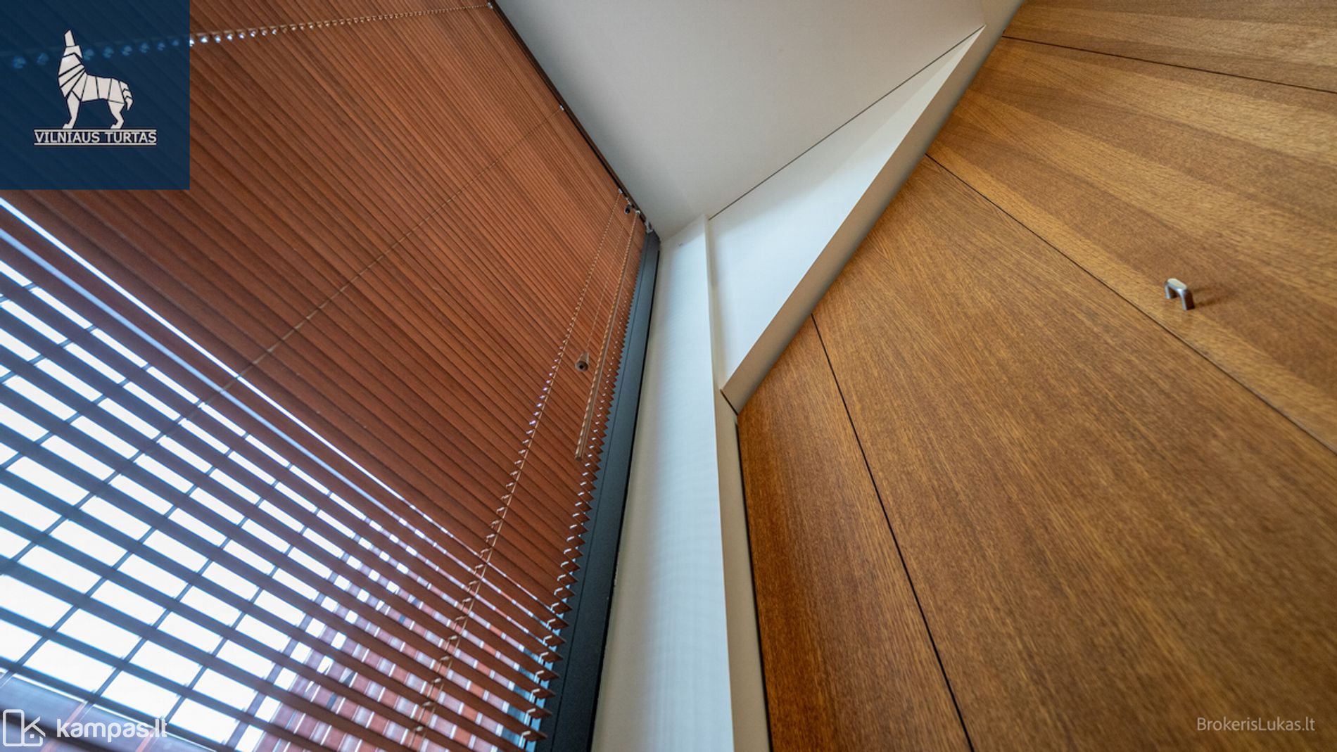 Natūralios medžio tekstūros, minkštos kreminės spalvos, ąžuolinės grindys ir išskirtinė stogo konstrukcija sukuria šiltą, vientisą estetiką, kurią papildo iki 4,57 m siekiančios lubos. Pro didelius langus prasiskvarbia ne tik dienos šviesa, bet ir atveria vaizdus į Senamiesčio stogus.