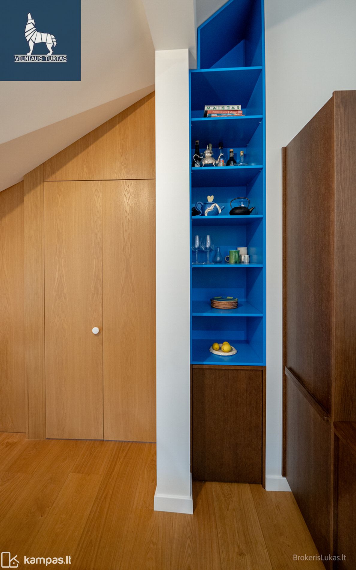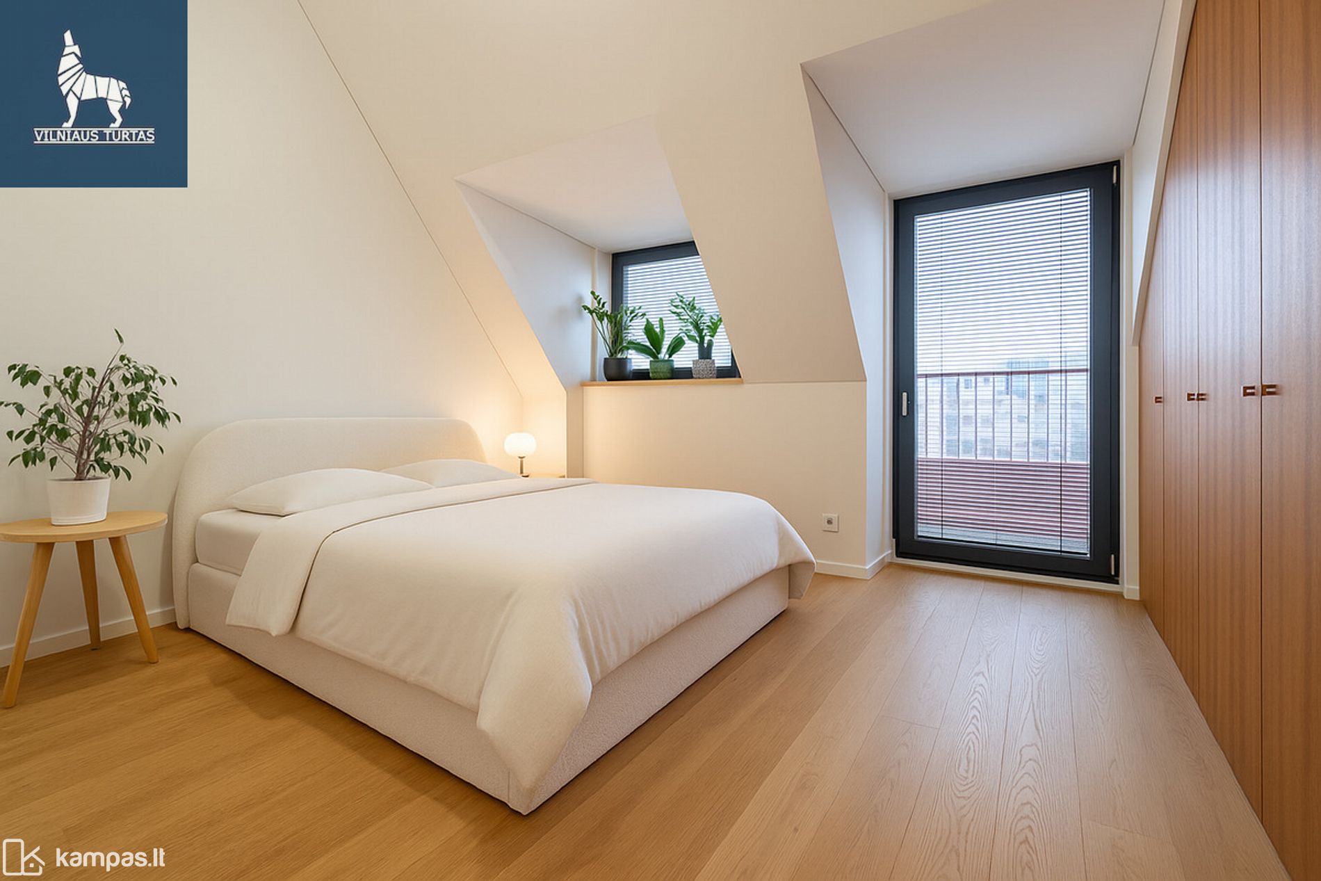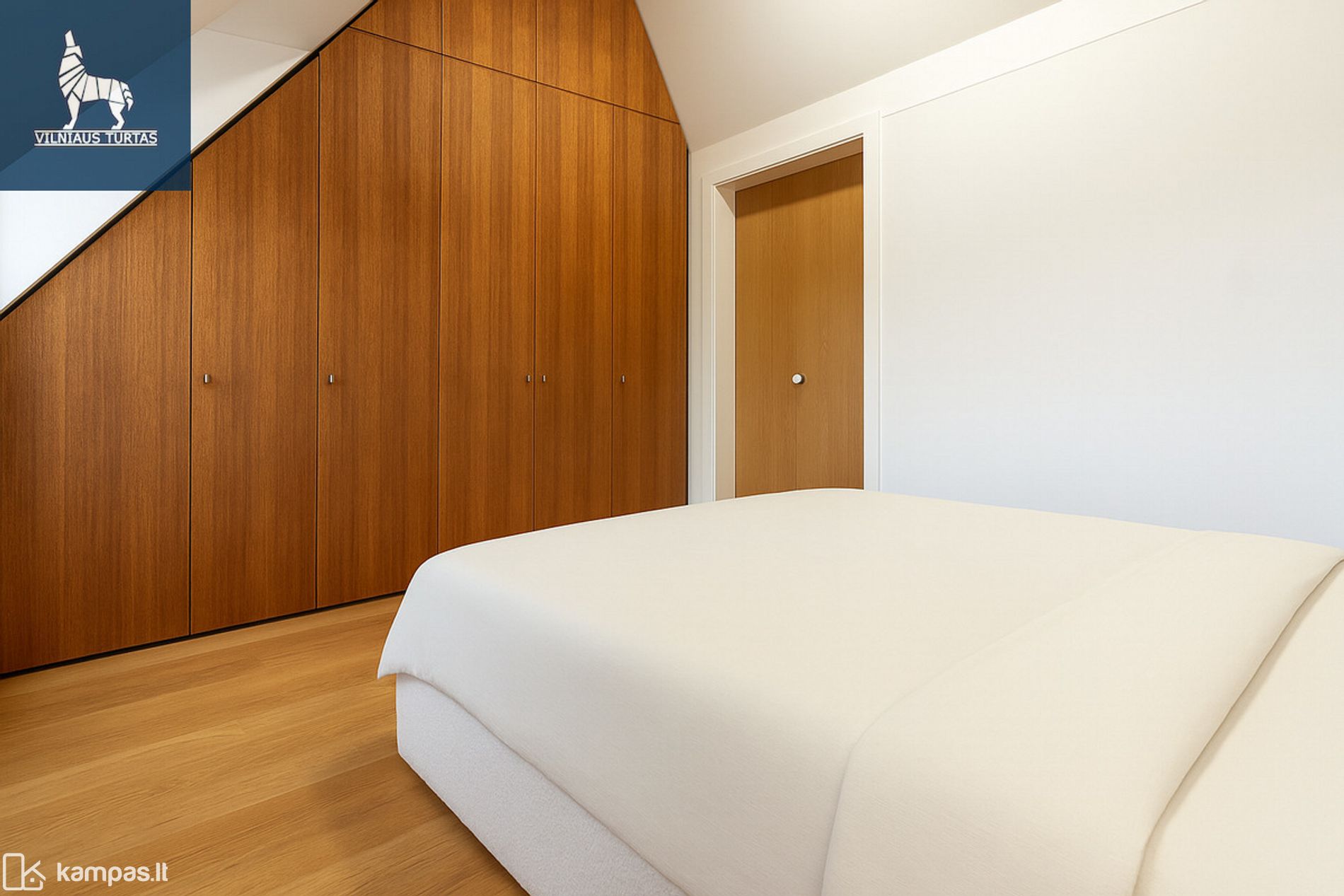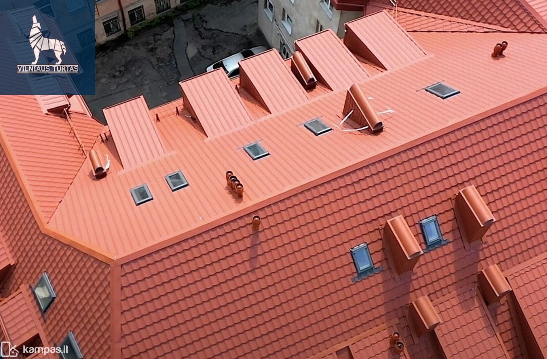 Natūralios medžio tekstūros, minkštos kreminės spalvos, ąžuolinės grindys ir išskirtinė stogo konstrukcija sukuria šiltą, vientisą estetiką, kurią papildo iki 4,57 m siekiančios lubos. Pro didelius langus prasiskvarbia ne tik dienos šviesa, bet ir atveria vaizdus į Senamiesčio stogus.