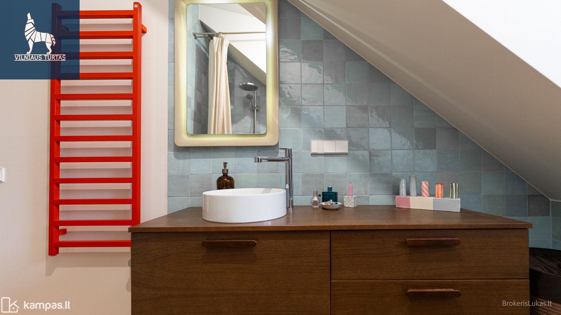 ・Vonios kambarys – vienas ryškiausių šio buto akcentų: žalsvos plytelės, laisvai stovinti vonia, „premium“ standarto santechnika ir išraiškinga raudono metalo džiovykla leidžia čia mėgautis tikra poilsio zona.