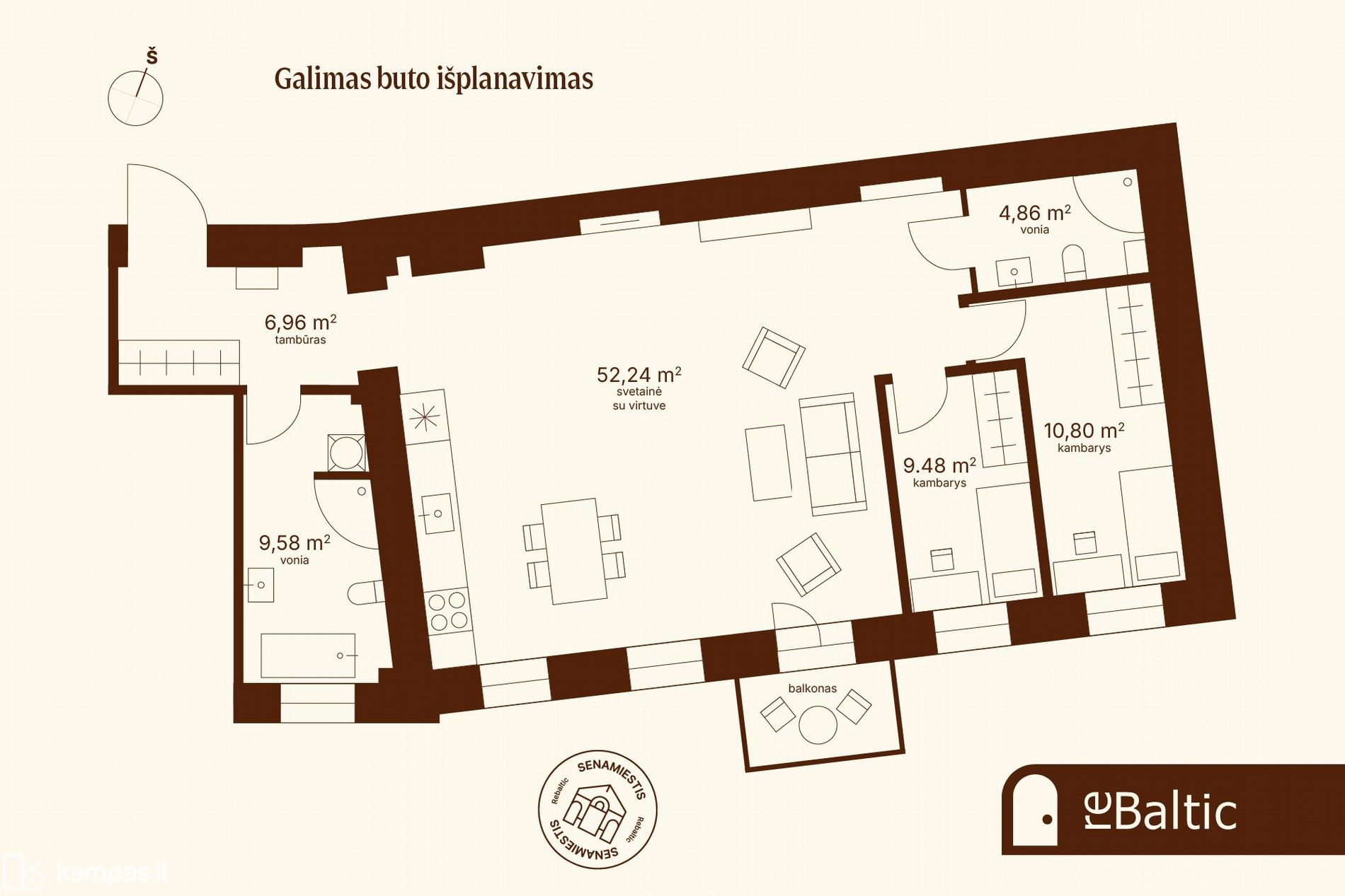 - Svetainė, miegamasis, darbo zona, vonios kambarys, balkonas