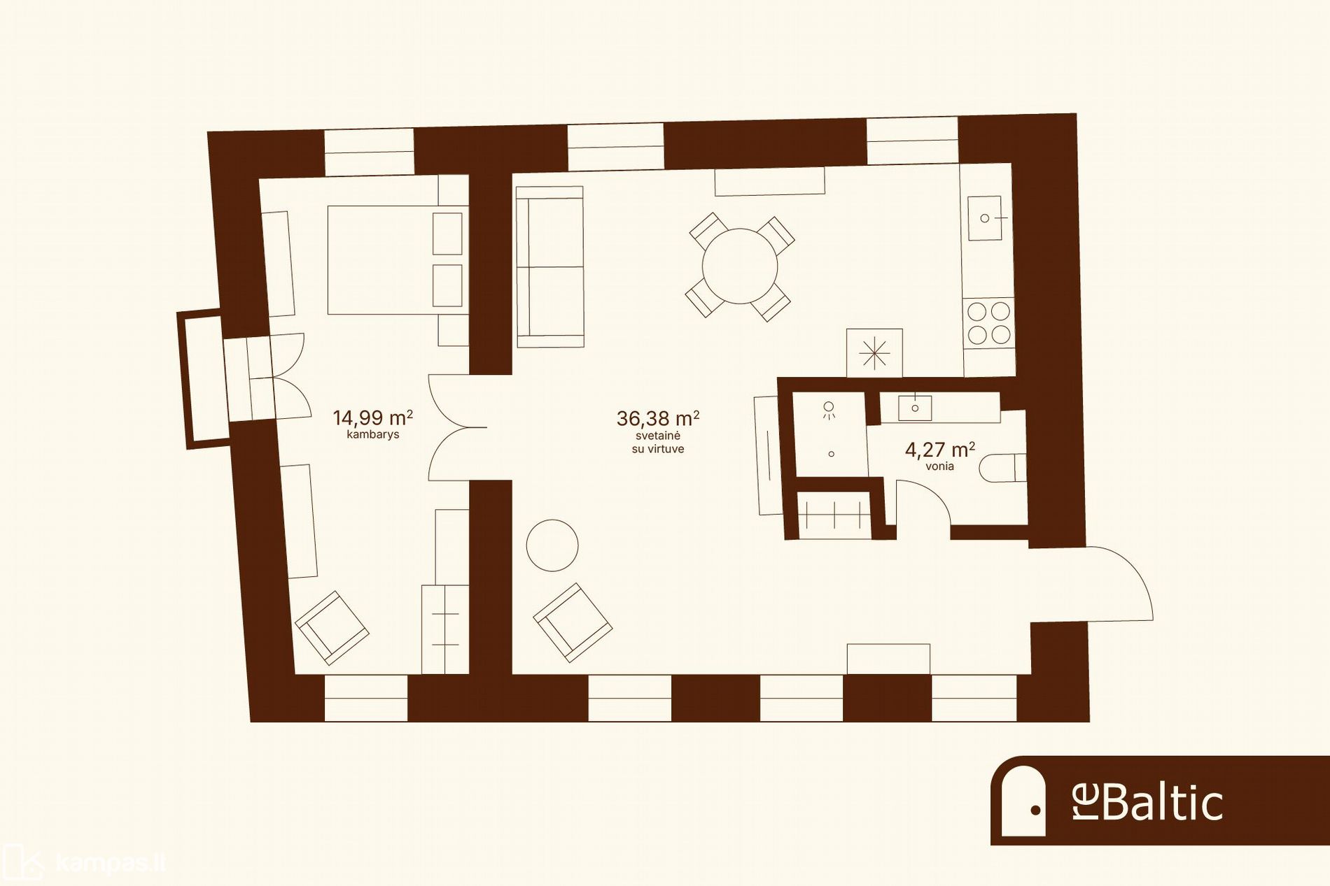 - Erdvi ir šviesi svetainės erdvė kartu su virtuve;