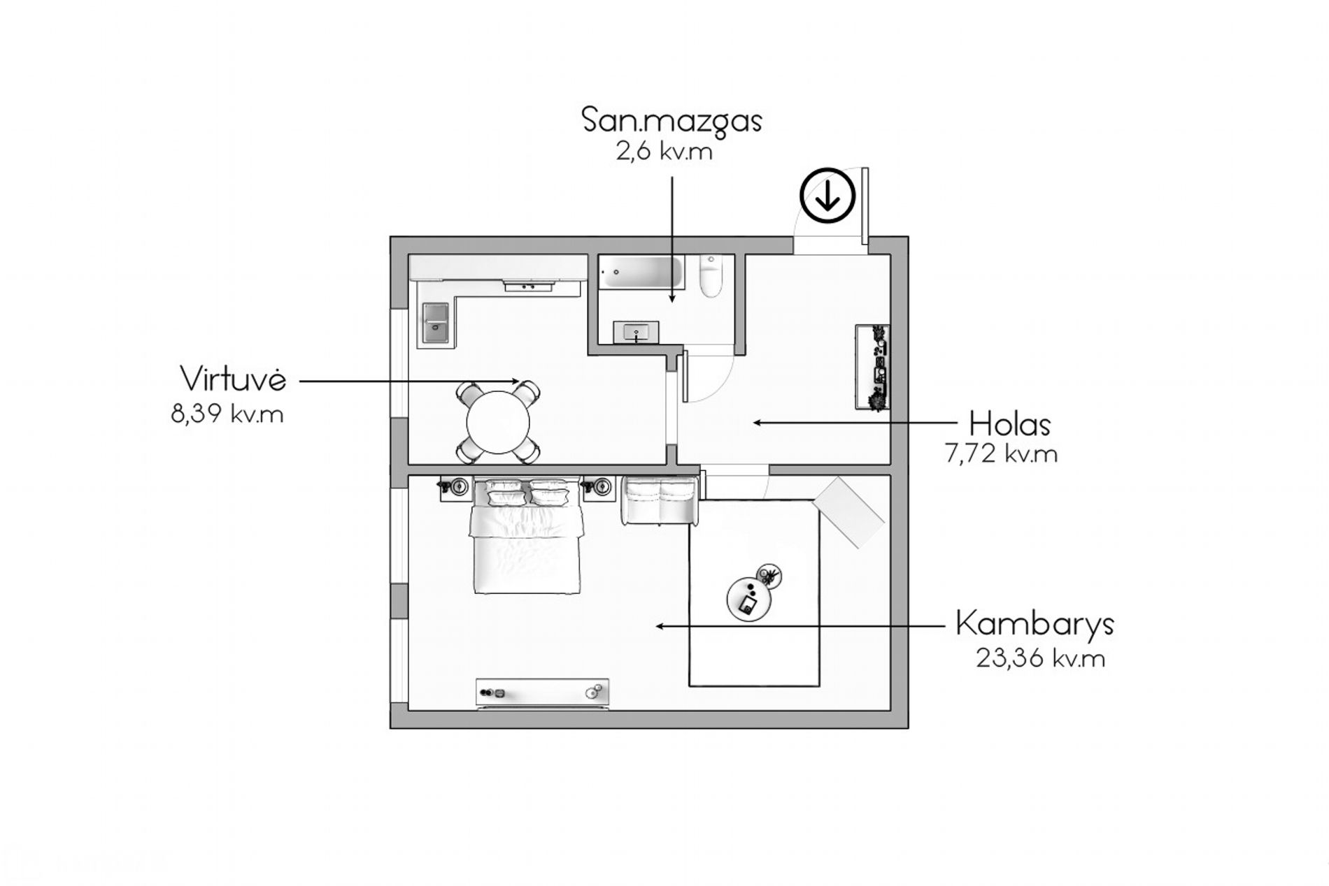 - Atlikus remontą galima perplanuoti objektą į patogų 2-jų kambarių butą.