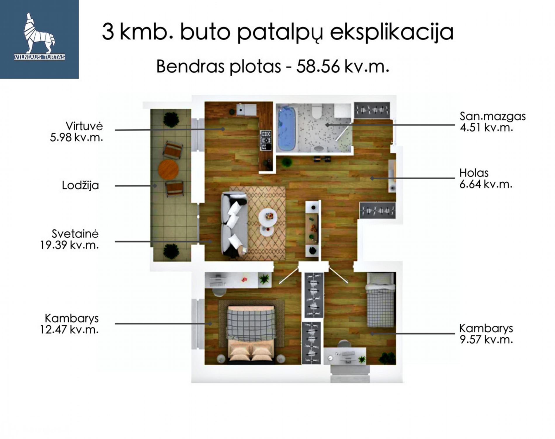 * Užuolaidos, šviestuvai, indai – butas paruoštas iškart įsikelti;