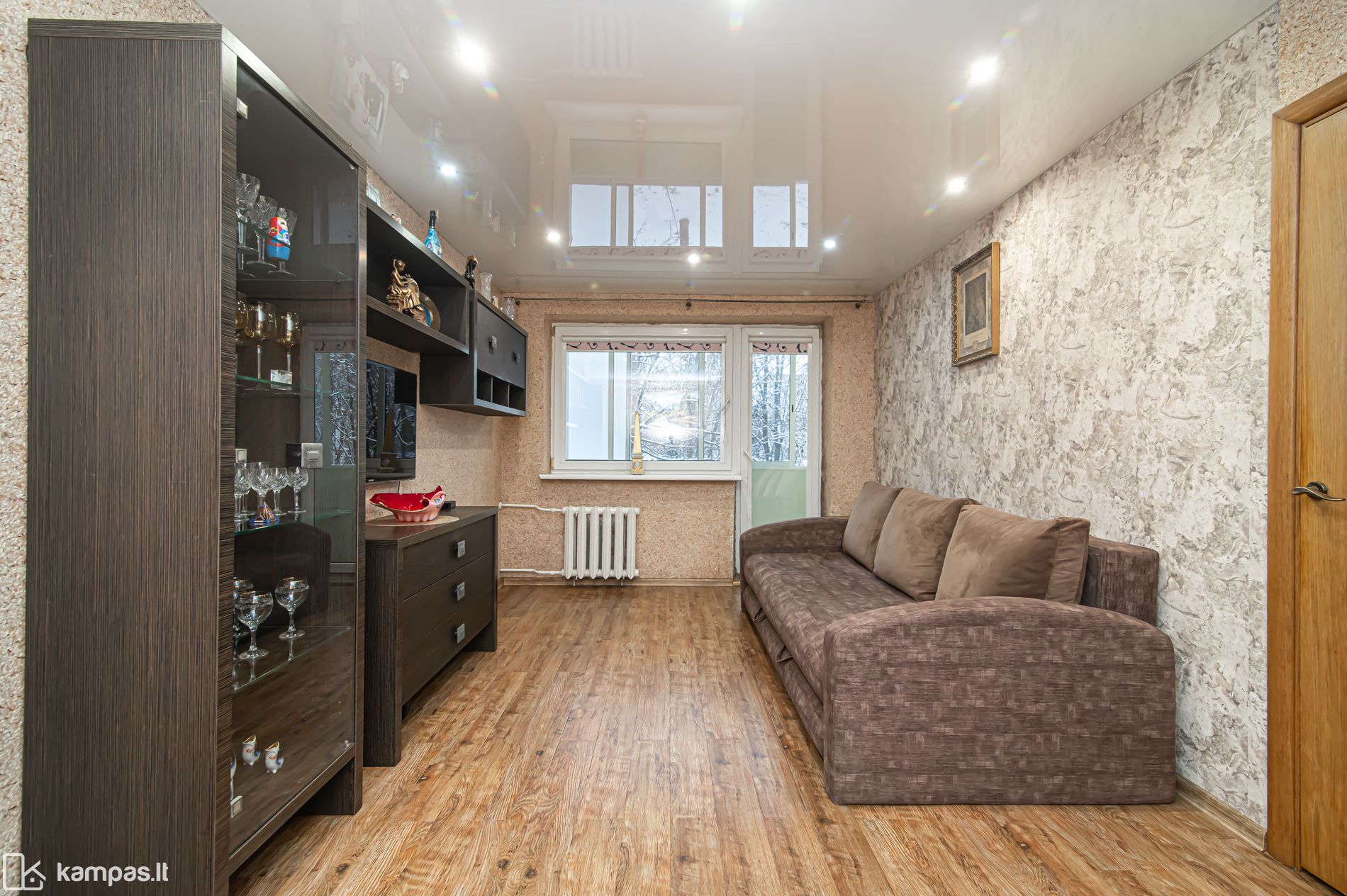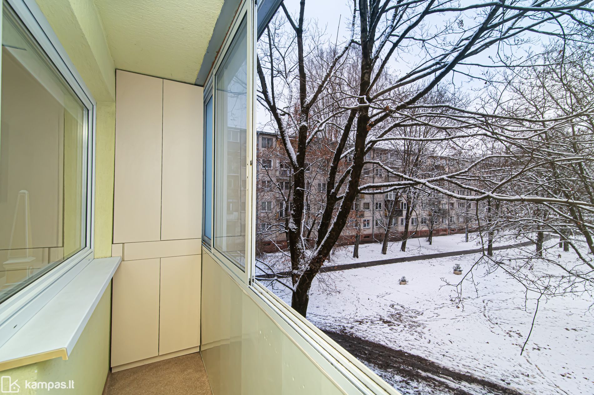- Gana erdvus (per dviejų kambarių sienų ilgius) įstiklintas balkonas, jame įrengtos dvi talpios spintos;