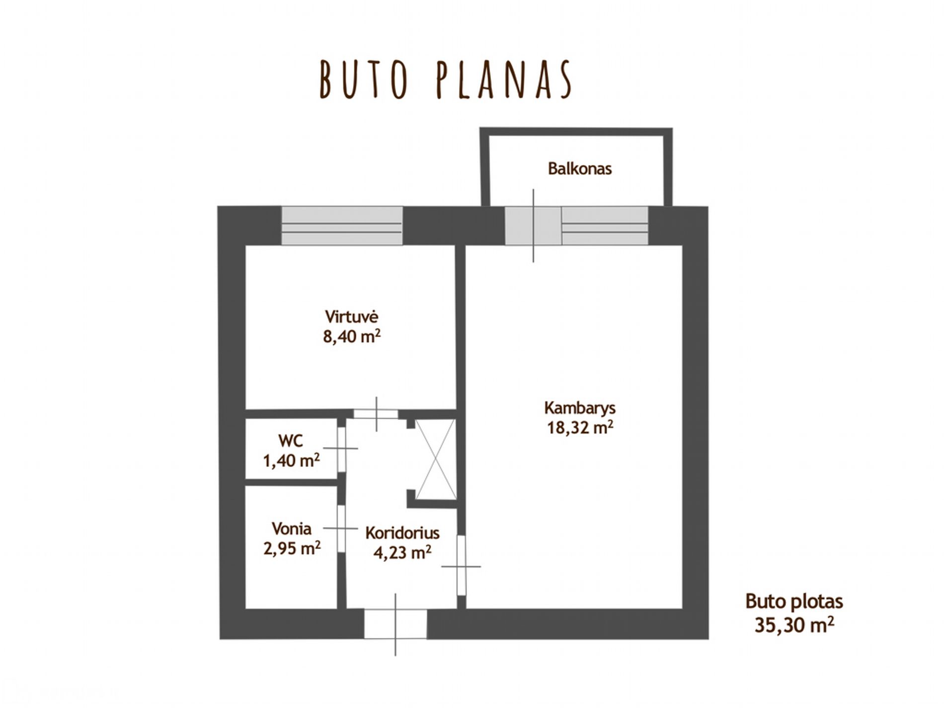 • Gyvenamasis kambarys baldais padalintas į dvi erdves – miegamą ir gyvenamąją