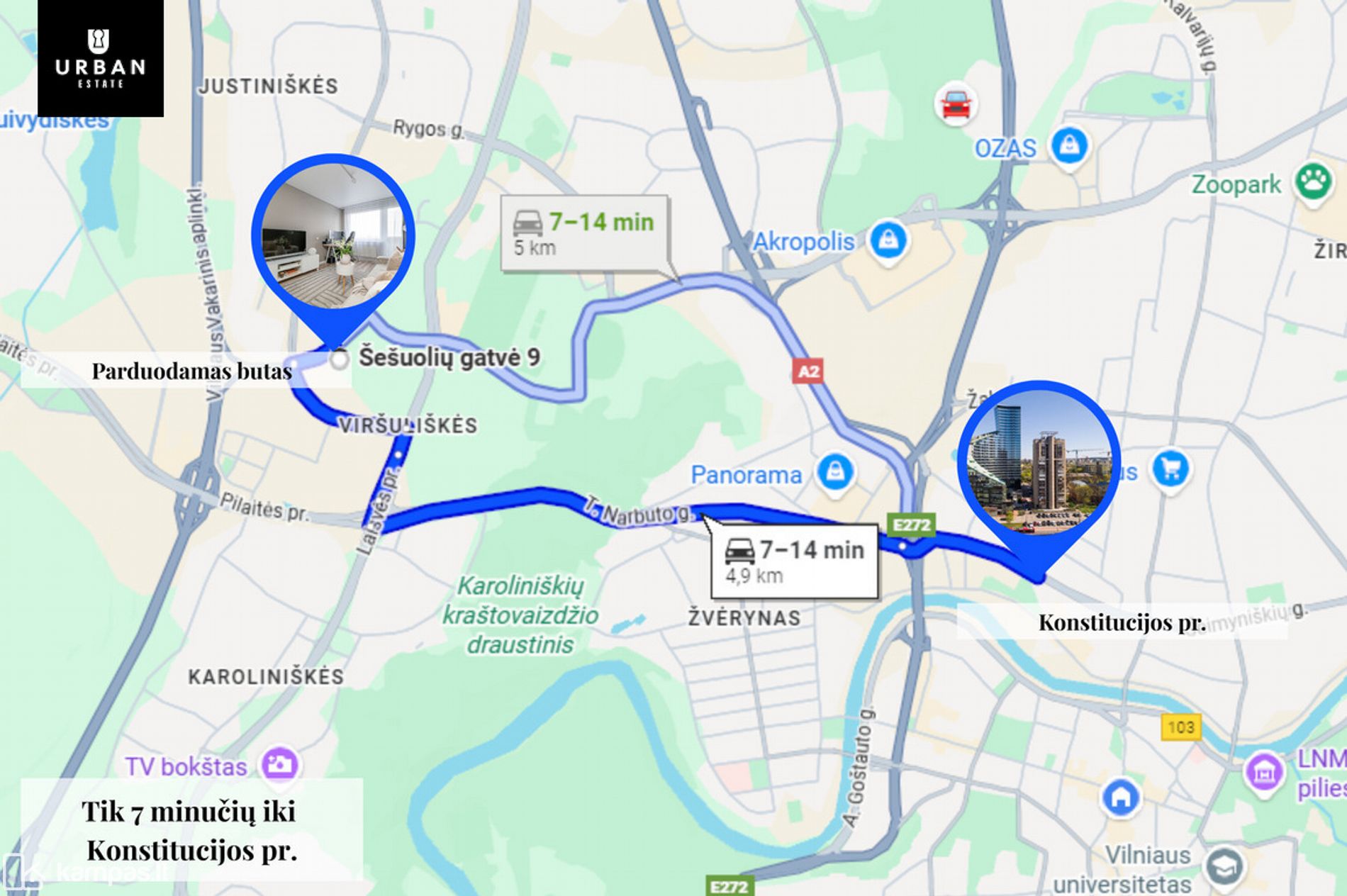 - Itin patogi vieta, puikiai išvystyta infrastruktūros - prie pat yra viešojo transporto stotelės, prekybos centrai, mokymo bei gydymo įstaigos. O norintiems atitrūkti nuo miesto šurmulio ir kasdienių darbų - pašonėje driekiasi Karoliniškių draustinis, kuriame galėsite ramiai pasivaikščioti ar aktyviai leisti laiką bėgiojant, važinėjantis dviračiu.