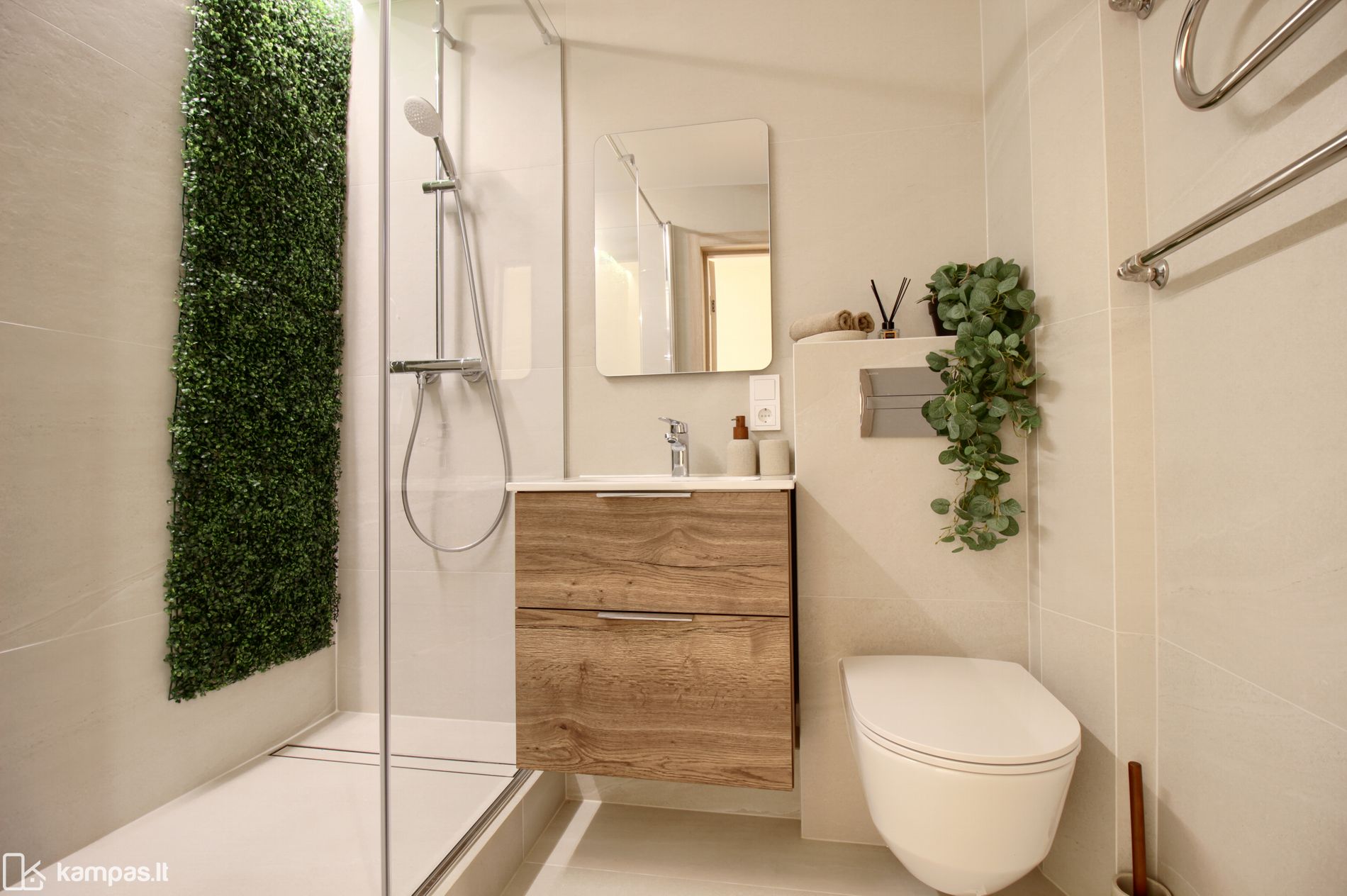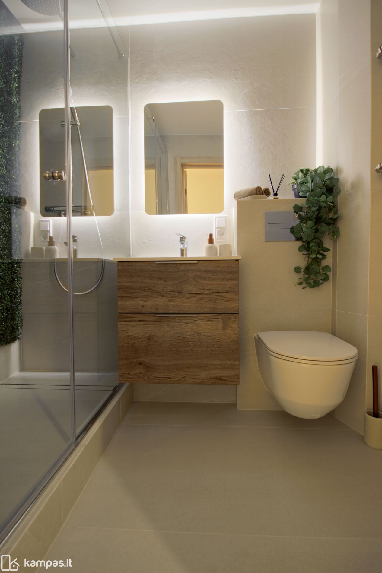 Vonios kambarys sujungtas kartu su wc. Vonios kambaryje naudota kokybiška santechnika ir keramika: pakabinamas wc – LAUFEN, dušas su termostatu HANSGROHE, kriauklės čiaupas – GROHE.