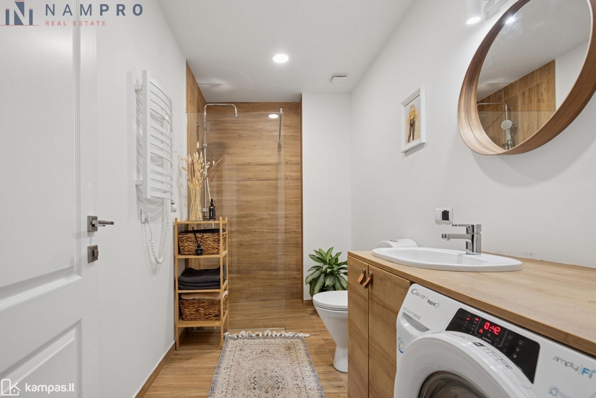 • Įrengta erdvi vonios patalpa su dušu, skalbykle ir vieta daiktų laikymui.