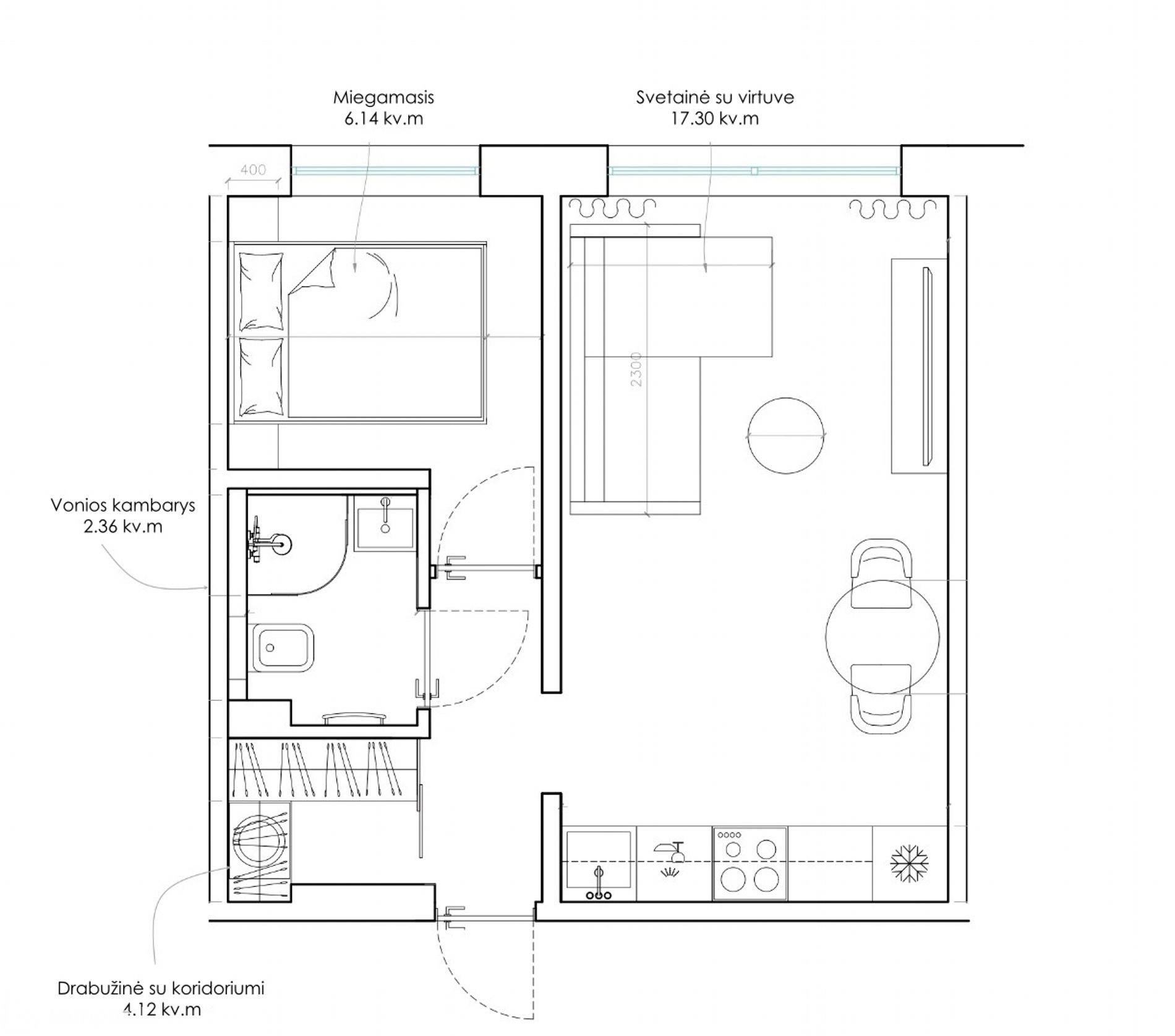 • Funkcionalus ir jaukus buto išplanavimas: jauki svetainė su virtuvės zona, izoliuotas miegamasis kambarys, san. mazgas, įeinama erdvi drabužinė