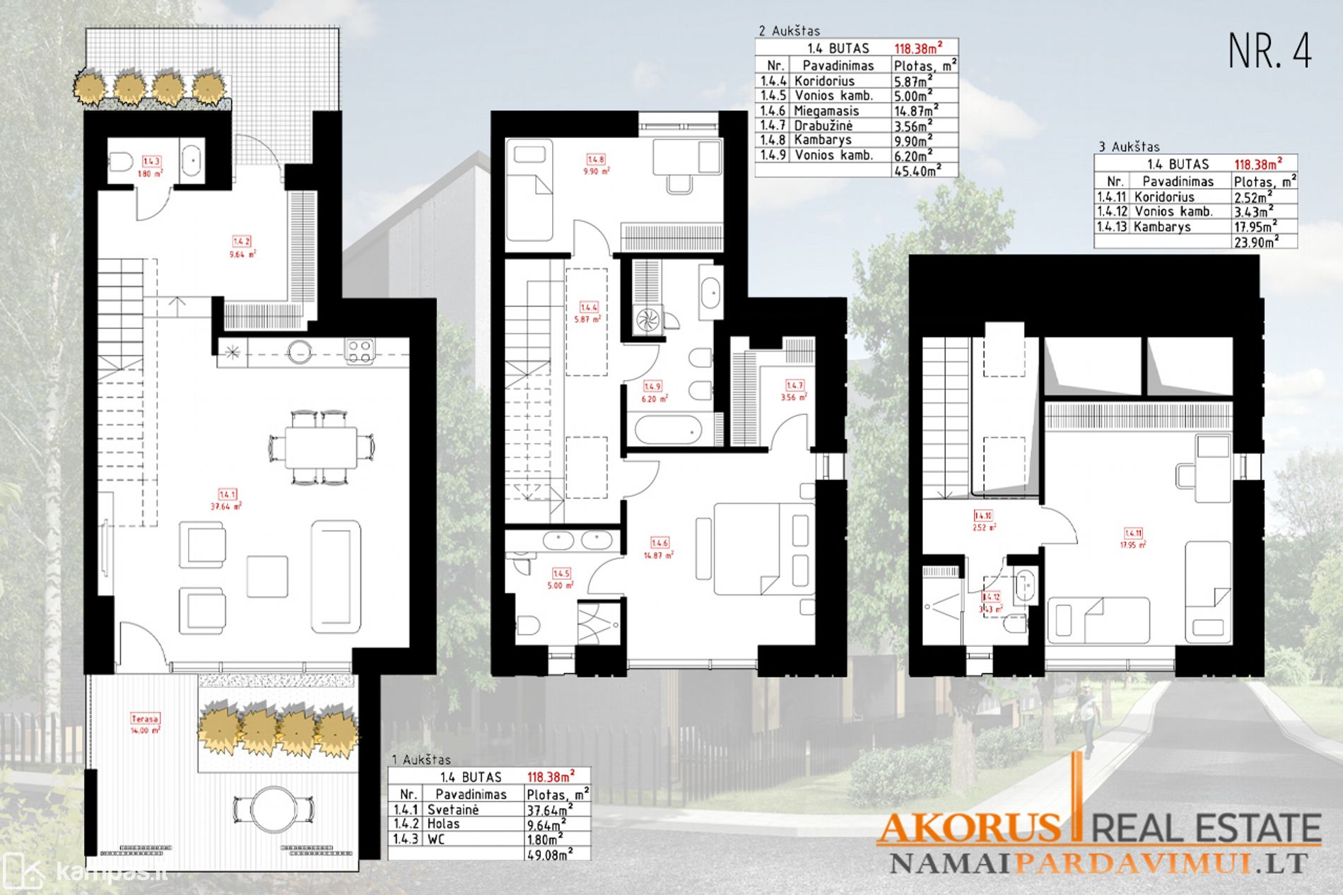 - aukštos lubos: pirmame, antrame aukšte – 3 m, trečiame aukšte – 4,2 m;