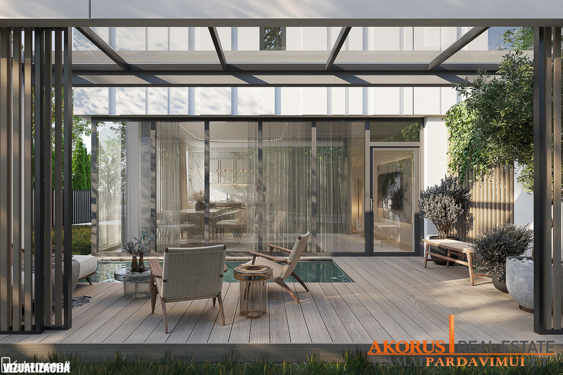 - slankiojanti aliuminio žaliuzių konstrukcija terasoje;