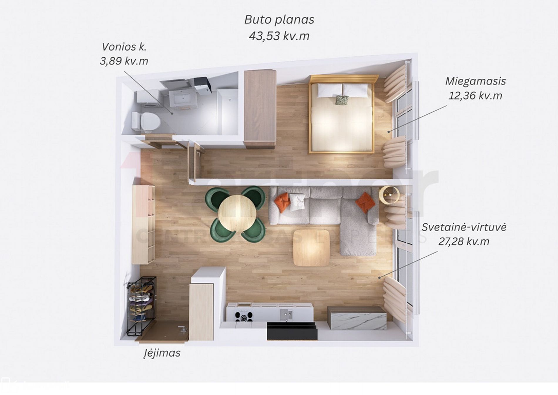 • Jame svetainė su virtuve, miegamasis, vonios kambarys ir koridorius.