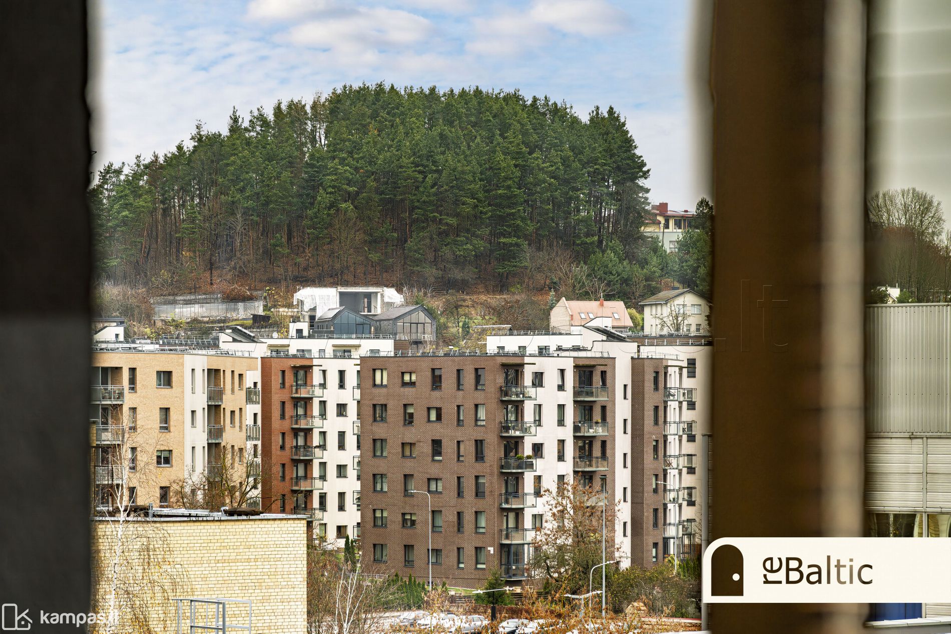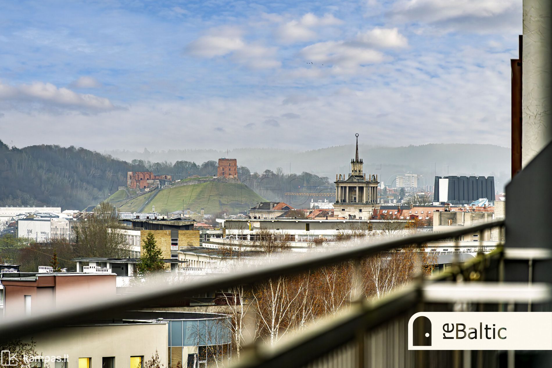 - Top floor of the building and a spacious 12 sq. m terrace offering panoramic views of Žvėrynas rooftops, hills, the city center, and Gediminas Castle