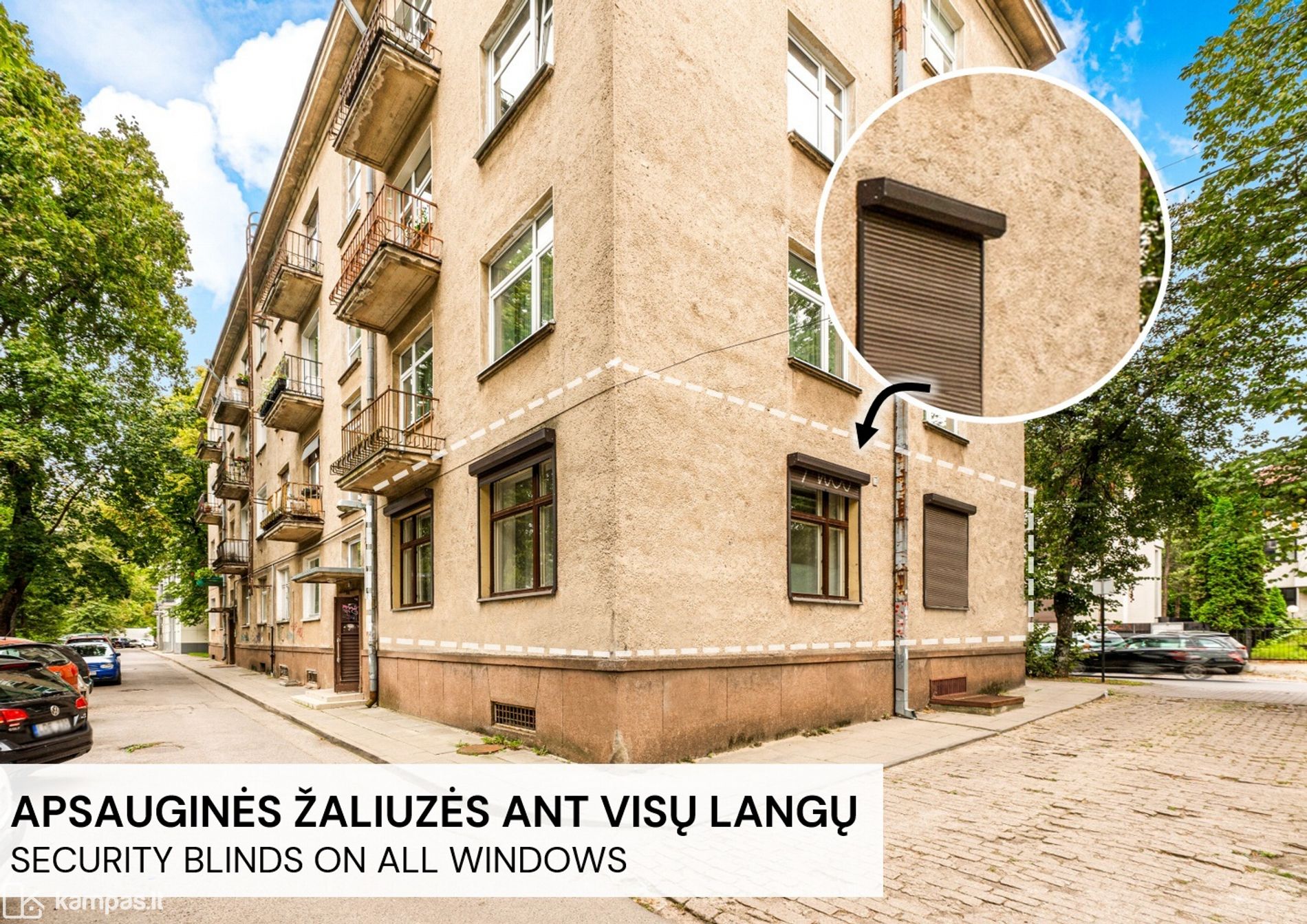 • Ant langų sumontuotos išorinės apsauginės žaliuzės (dėl apsaugos ir dėl karščio vasarą)