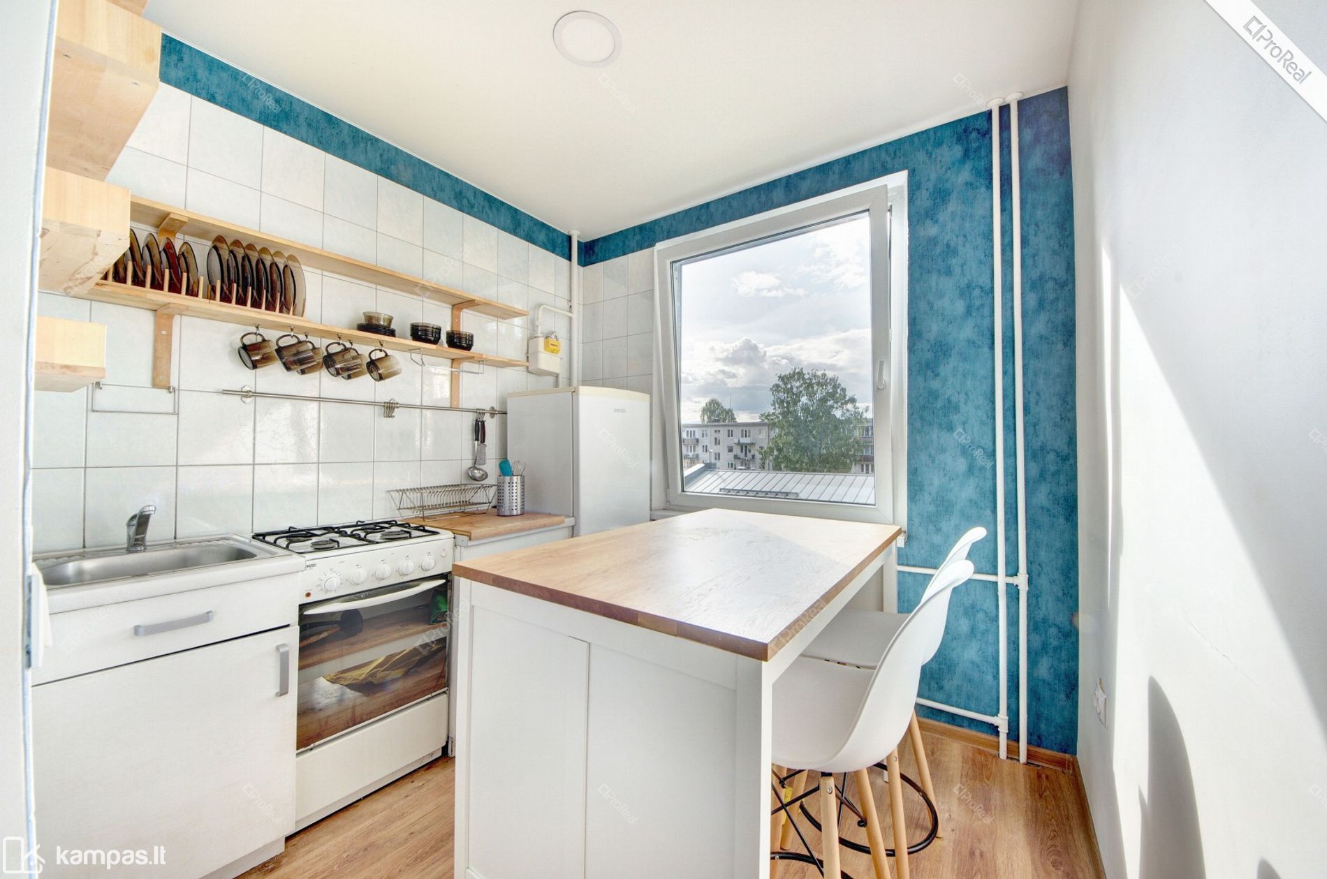 Virtuvėje: kėdės, stalas, spintelės.