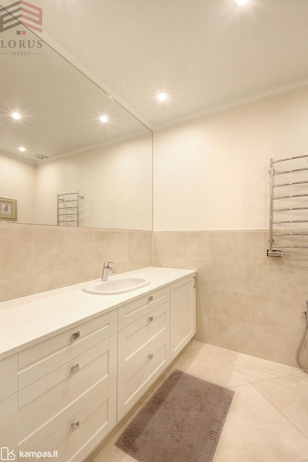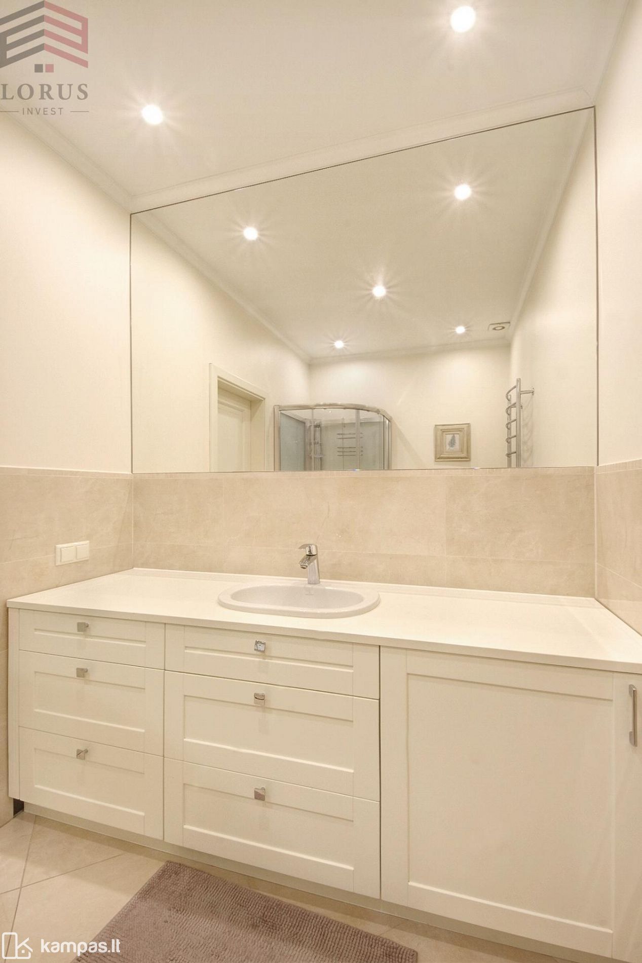 ⏺ Šviesus vonios kambarys su reikalingiausia buitine technika, dušo kabina, veidrodis per visą sieną, integruota skalbimo mašina;